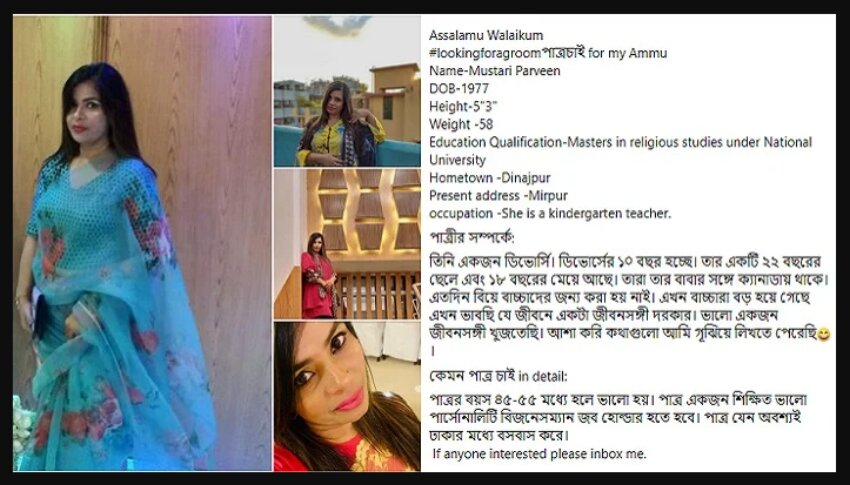 মায়ের সম্পর্কে বিস্তারিত তথ্যে ফারাহ জানান, ‘পাত্রীর নাম মুস্তারি পারভীন। জন্ম ১৯৭৭ সালে। উচ্চতা ৫ ফুট ৩ ইঞ্চি, ওজন ৫৮ কেজি। জাতীয় বিশ্ববিদ্যালয়ের অধীনে স্নাতকোত্তর সম্পন্ন করেছেন। স্থায়ী ঠিকানা: দিনাজপুর, বর্তমান ঠিকানা: মিরপুর। তিনি পেশায় একজন শিক্ষক।’