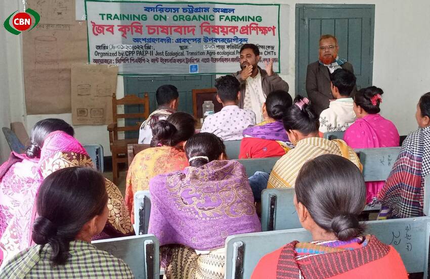 বান্দরবান জেলার লামা উপজেলায় কারিতাস দুর্গম পাহাড়ি পাড়ায় পাড়ায় ৪ ব্যাচে জৈব পদ্ধতিতে চাষাবাদ বিষয়ক প্রশিক্ষণ সম্পন্ন হয়েছে। গত ৮ জানুয়ারী শুরু হয়ে ১৩ জানুয়ারী এ প্রশিক্ষণ শেষ হয়। কারিতাস বাংলাদেশ এর সিপিপি পিএইপি-২ এর উদ্যোগে উপজেলার ফাঁসিয়াখালী ইউনিয়নের রাজাপাড়া, বনপুর সহ বিভিনইন পাড়ার ১০০ জন প্রান্তিক উপকারভোগী কৃষক প্রশিক্ষণ গ্রহণ করেন। সর্বমোট ৪ ব্যাচো এ প্রশিক্ষণে বিভিন্ন ধরণের জৈব বালাই নাশক প্রস্তুতকরণ ও বিভিন্ন পদ্ধতিতে জৈব সার উৎপাদন, বীজ সংরক্ষণ, কৃষি ফসলের চাষাবাদ কলাকৌশল হাতে কলমে শিখানো হয়। এতে উপজেলার সহকারী কৃষি সম্প্রসারণ কর্মকর্তা মোঃ মহিউদ্দিন, উপ-সহকারী কৃষি কর্মকর্তা সুকুমার দেওয়ান্জি, উপ-সহকারী কৃষি কর্মকর্তা অমরজিত, প্রকল্পের মাঠ সহায়ক রিন্টু চাকমা, নিরতা তংচংগ্যা, প্রিয়াংকা ত্রিপুরা, হিম্যানটারিয়ান ফাউন্ডেশনের মাঠ সহায়ক বীর সিংহ চাকমা প্রশিক্ষক ছিলেন। প্রশিক্ষণের সত্যতা নিশ্চিত করে সিপিপি পিএইপি-২ প্রকল্পের মাঠ কর্মকর্তা মামুন সিকদার বলেন, এ প্রশিক্ষন পরবর্তী জৈবিক উপায়ে চাষাবাদের জন্য জন প্রতিজন উপকারভোগী কৃষককে ৪২০০ টাকার কৃষি বীজ, আইপিএম টুলস্, জৈবসার উৎপাদনের জন্য উপকরণ করা হবে।
