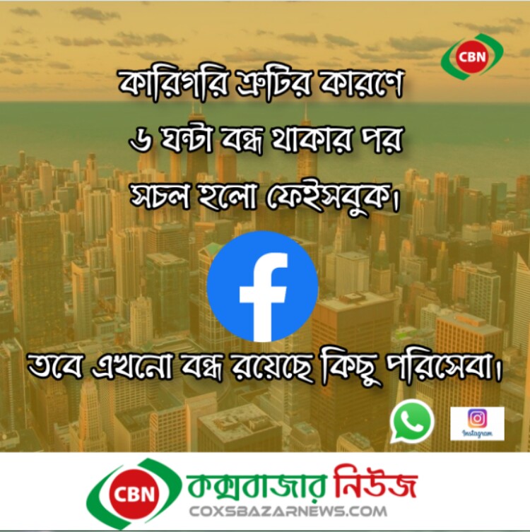 অনলাইন ডেস্ক: প্রায় ৬ ঘণ্টা ডাউন থাকার পর সামাজিক যোগাযোগ মাধ্যম ফেসবুক, হোয়াটসঅ্যাপ ও ইনস্টাগ্রাম অনলাইনে ফিরেছে।