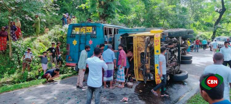 বান্দরবানের লামা উপজেলায় কাভার্ড ভ্যানের চাপায় বাস চালক নিহত ও ২৯ বাস যাত্রী আহত হয়েছেন। বুধবার সকালে উপজেলার ফাঁসিয়াখালী-লামা সড়কের মিরিঞ্জা মাদানীনগর এলাকায় এ দূর্ঘটনা ঘটনা ঘটে। নিহত বাস চালকের নাম মো. আনোয়ার হোসেন (৫০)। তিনি কক্সবাজার জেলার চকরিয়া পৌরসভা এলাকার সোসাইটি পাড়ার বাসিন্দা ও বাস টার্মিনাল শ্রমিক ইউনিটির সহ-সভাপতি বলে জানা গেছে। ফায়ার সার্ভিস ও সিভিল ডিফেন্স সদস্যরা আহতদেরকে উদ্ধার করে লামা ও চকরিয়া উপজেলা স্বাস্থ্য কমপ্লেক্সেসহ বিভিন্ন ক্লিনিকে ভর্তি করেন। আহতদের মধ্যে বেশ কয়েকজনের নাম পাওয়া গেছে। তারা হলেন- জোৎস্না দে (২০), শুভশ্রী (১০), রূপম চাকমা (২), জহর লাল (৫৫), নুর মোহাম্মদ (২৮), মোঃ সোহেল (৩২), রাজশ্রী দে (২), নুরুল আলম (৩০), হাসনা বালা (৬০), মনু আলম (৩৫), তপন (৩৮), সরওয়ার (২৫), মোঃ রফিক (৩০), সরওয়ার আলম (৫৫), মোঃ সাহেদ (৬৫), শিব সংকর (৩৭), জেসি মার্মা (২২), আবুল হোসেন (৫৫), বাসের হেলপার মো. বেলাল (২৪), মেরি আক্তার (৪৫), মোহছেনা বেগম (৪০), আকিব (১০), ইমু (৬), জিহান (১৮), জাহানারা বেগম (৪৮), পাখি বালা (৭০) সহ ১৬ জন। তাৎক্ষণিকবাবে অন্য আহত ব্যক্তিদের নাম পরিচয় পাওয়া যায়নি। আহতরা সবাই উপজেলা ও পাশের চকরিয়া উপজেলার বমু বিলছড়ি ইউনিয়নের বাসিন্দা। আহতদের মধ্যে ১০জনের অবস্থা আশঙ্কজনক হওয়ায় উন্নত চিকিৎসার জন্য কক্সবাজার ও চট্টগ্রাম মেডিকেল কলেজ হাসপাতালে পাঠানো হয়েছে। কাভার্ড ভ্যানের অদক্ষ চালকের কারণে এ দুর্ঘটনার হয় বলে যাত্রী সাধারণের অভিযোগ। দুর্ঘটনার খবর পেয়ে স্বাস্থ্য কমপ্লেক্সে ও দুর্ঘটনার স্থান পরিদর্শন করে আহতদের খোজঁখবর নেন, পৌরসভার মেয়র মো. জহিরুল ইসলাম ও উপজেলা পরিষদের চেয়ারম্যান মো. মোস্তফা জামাল।