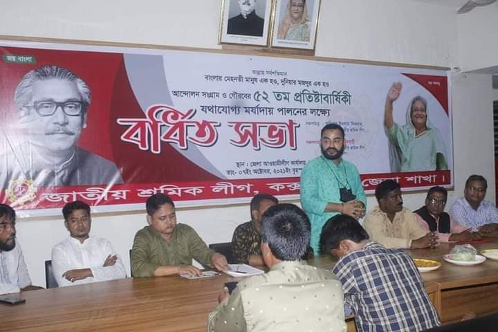 ১২ অক্টোবর জাতীয় শ্রমিক লীগের আন্দোলন সংগ্রাম ও গৌরবের ৫২তম প্রতিষ্ঠা বার্ষিকী যথাযোগ্য মর্যাদায় পালনের লক্ষ্যে জাতীয় শ্রমিক লীগ কক্সবাজার জেলা শাখার বর্ধিত সভা অনুষ্ঠিত হয়েছে। ৭ অক্টোবর বৃহস্পতিবার বিকাল ৫টায় জেলা আওয়ামীলীগ কার্যালয়ে সংগঠনের সহ-সভাপতি শফিকুল ইসলাম কালুর সভাপতিত্বে উক্ত বর্ধিত সভায় বক্তব্য রাখেন সংগঠনের সাধারণ সম্পাদক শফিউল্লাহ আনসারী যুগ্ম সম্পাদক ছৈয়দ রাশেদুল হক সোহেল, দপ্তর সম্পাদক এম ওসমান গনি, চকরিয়া উপজেলা সভাপতি জামাল উদ্দিন, পেকুয়া উপজেলা সভাপতি নুরুল আবছার, মহেশখালী উপজেলার সভাপতি আবদু শুক্কুর, কুতুবদিয়া উপজেলা আহবায়ক নুরুল ইসলাম কুতুবী, রামু উপজেলা সভাপতি শফিকুল ইসলাম কাজল, হোটেল শ্রমিক লীগ সাধারণ সম্পাদক সেলিম বিল্ডার, মৎস্যজীবী শ্রমিক লীগ সভাপতি খুরশেদ আলম। উক্ত বর্ধিত সভায় আন্দোলন সংগ্রাম ও গৌরবের ৫২তম প্রতিষ্ঠা বার্ষিকী সফল করতে মাসব্যাপী কর্মসূচি গ্রহণ ও তৃণমূলে সংগঠনকে শক্তিশালী করতে বিভিন্ন সিদ্ধান্ত গৃহীত হয়।