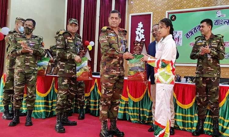 বান্দরবানে বঙ্গবন্ধু ৯ম বাংলাদেশ গেমস পদক বিজয়ী কৃতি খেলোয়াড়দের সংবর্ধনা দিয়েছে বান্দরবান সেনা রিজিয়ন। রোববার (১০অক্টোবর) সকালে বান্দরবান ক্যান্ট: পাবলিক স্কুল এন্ড কলেজ মিলনায়তনে বান্দরবান সেনা রিজিয়নের রিজিয়ন কমান্ডার ব্রিগেডিয়ার জেনারেল মোঃ জিয়াউল হক প্রধান অতিথি হিসেবে উপস্থিত থেকে এ সংবর্ধনা দেন। এসময় একক ও দলগত ভাবে কাতা, কুমিতে, খো খো, কারাতে, উশু, তায়কোয়ানডো, জুডো, বক্সিং, টেবিল টেনিস, জিমন্যাস্টিকস, পোলভোল্ট ও এ্যাথলেটিকস এর ২৮জন অংশগ্রহনকারী খেলোয়ার, ৪জন কোচ, ৩ জন ম্যানেজার, ১জন সহকারী কোচ ১ জন অফিসিয়াল ও ১ জন ম্যানেজারকে সংবর্ধনা দেয়া হয়।