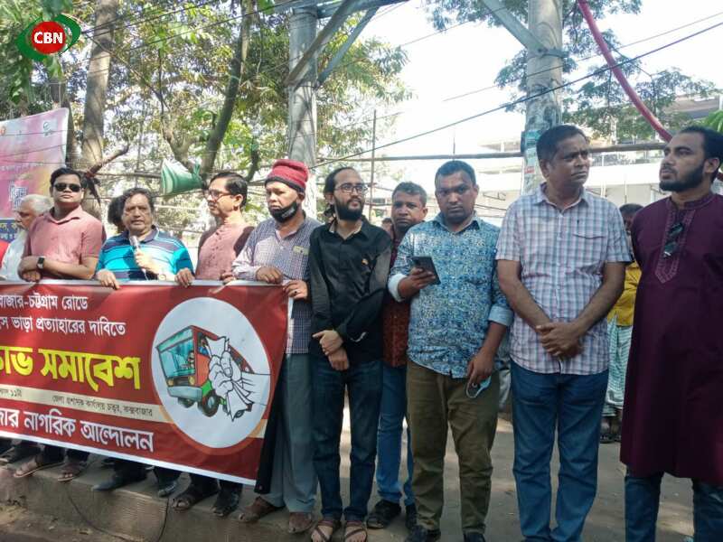 বক্তারা আরও বলেন, কক্সবাজারের মানুষ বিভিন্ন কাজে ঢাকা—চট্টগ্রাম দেশের নানা প্রান্তে যায়। কিন্তু সম্প্রতি তেলের দাম বৃদ্ধির অযুহাতে অসামঞ্জস্যভাবে বাড়ানো হয়ে বাসের ভাড়া। ভয়ংকর অসামঞ্জস্যতা উঠে এসেছে এক পরিসংখ্যানে। এই অনিয়ম ও অন্যায় কেন? আমরা সাধারণ মানুষ, কেন সবসময় এসব মাফিয়াদের কাছে জিম্মি থাকবো? অবিলম্বে অতিরিক্ত বাস ভাড়া প্রত্যাহার না হলে অবরোধ ও হরতালসহ কঠোর কর্মসূচি গ্রহণ করা হবে সাধারণ নাগরিকদের পক্ষ থেকে।