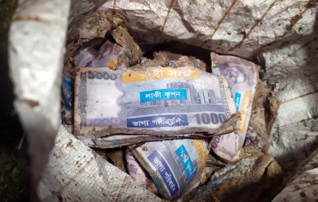 তিনি জানান, উদ্ধার হওয়া টাকার বান্ডিলের উপর ‘লাকি কুপন’, ‘সাথী কুপন’, ‘ভাগ্য বদল’ ইত্যাদি চিরকুট লেখা আছে।