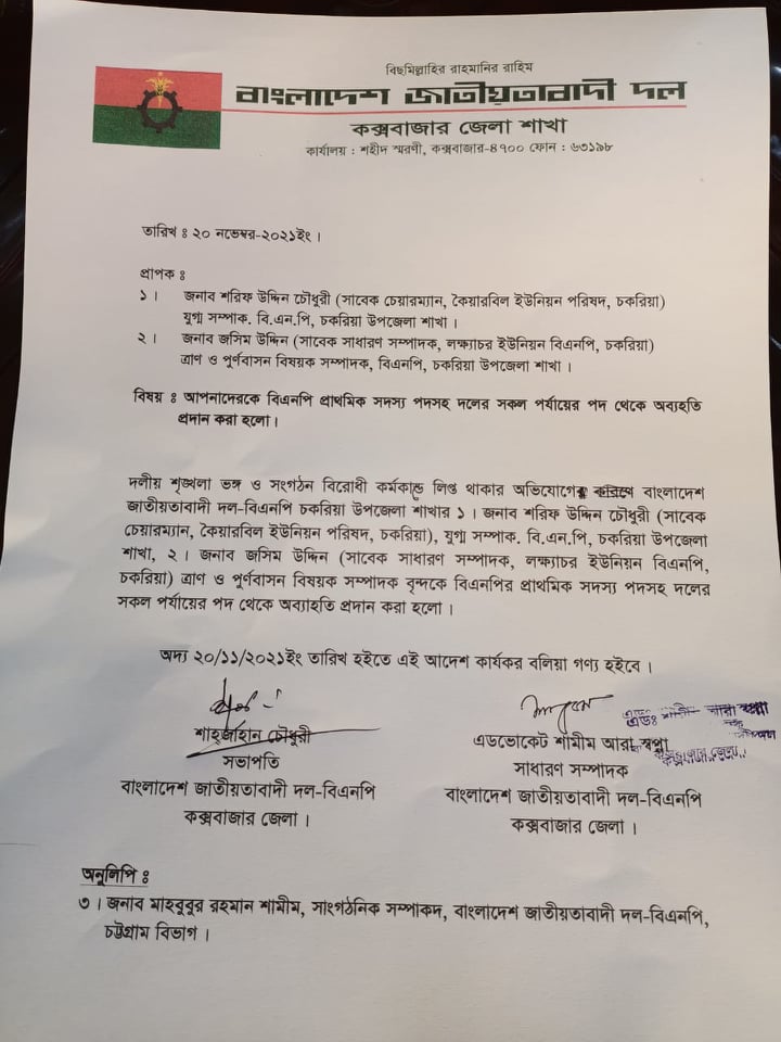 কক্সবাজার জেলা বিএনপির সভাপতি সাবেক এমপি শাহজাহান চৌধুরী ও সাধারণ সম্পাদক এডভোকেট শামীম আরা স্বপ্না স্বাক্ষরিত এক সংবাদ বিজ্ঞপ্তিতে এ বহিস্কার আদেশ জানা গেছে। এবং এ বহিস্কার আদেশ ২০ নভেম্বর ২০২১ সাল থেকে কার্যকর হবে।