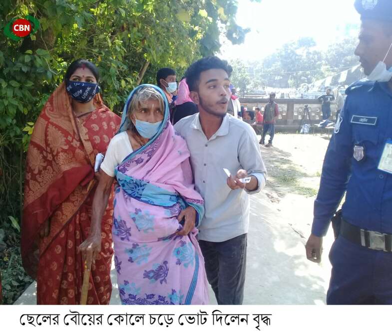 বয়স হয়েছে ৮১ বছর। তবু ভোটের অধিকার ছাড়তে নারাজ মিনু সেন নামের এই বৃদ্ধ। তাই ছেলের বৌয়ের কোলে চড়ে ভোট দিতে আসেন এই বৃদ্ধ।