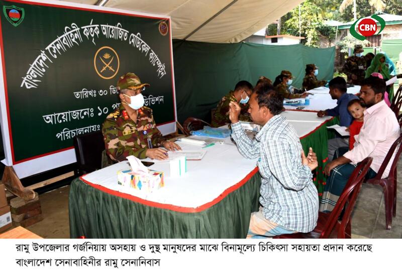 অসহায় ও দুস্থ মানুষদের মাঝে বিনামূল্যে চিকিৎসা সহায়তা প্রদান করেছে বাংলাদেশ সেনাবাহিনীর রামু সেনানিবাস। বৃহস্পতিবার (৩০ ডিসেম্বর) কক্সবাজার রামু উপজেলার গর্জনিয়া ইউনিয়নের সরকারি উচ্চ বিদ্যালয় মাঠে রামু সেনানিবাস এর বিশেষজ্ঞ চিকিৎসক দল দিনব্যাপী মেডিকেল ক্যাম্পেইনের মাধ্যমে প্রায় ৬০০ জন রোগীর মাঝে বিনামূল্যে চিকিৎসা সেবা , প্রয়োজনীয় ওষুধ সরবরাহ সহ চক্ষুরোগে আক্রান্ত রোগীদের মাঝে চশমা বিতরণ করেন। জিওসি, ১০ পদাতিক ডিভিশন ও এরিয়া কমান্ডার কক্সবাজার এরিয়া মেজর জেনারেল মো. ফখরুল আহসান, বিএসপি, এনডিইউ, পিএসসি মেডিকেল ক্যাম্পের কার্যক্রম পরিদর্শন করেন। এসময় সামরিক ও অসামরিক কর্মকর্তা এবং স্থানীয় জনপ্রতিনিধি, গণ্যমান্য ব্যক্তিগণ উপস্থিত ছিলেন।