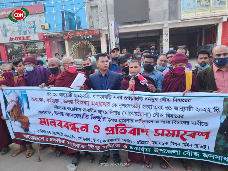 খাগড়াছড়িতে সদর উপজেলায় গুগড়াছড়িতে ধর্মসুখ বিহারের অধ্যক্ষ বিশুদ্ধ মহাথেরকে হত্যার প্রতিবাদে সংঘরাজ ভিক্ষু সমিতি ও চকরিয়া উপজেলার বৌদ্ধ জনসাধারনের মানববন্ধন ও প্রতিবাদ সমাবেশ অনুষ্ঠিত হয়েছে। আজ বিকাল ৩টায় কক্সবাজারের চকরিয়ায় চট্টগ্রাম মহাসড়কস্থ ষ্টেশন মেইন রোড়ে এই মানববন্ধন কর্মসূচীর আয়োজন করে চকরিয়ায় সংঘরাজ ভিক্ষু সমিতি ও চকরিয়া উপজেলা বৌদ্ধ জনসাধারন। মানববন্ধনে বিভিন্ন বিহারের বৌদ্ধ ভিক্ষু ও বৌদ্ধ ধর্মাবলম্বীরা সহ সামাজিক, রাজনৈতিক নেতৃবৃন্দরা এ মানববন্ধন ও প্রতিবাদ সমাবেশে অংশ নেন।