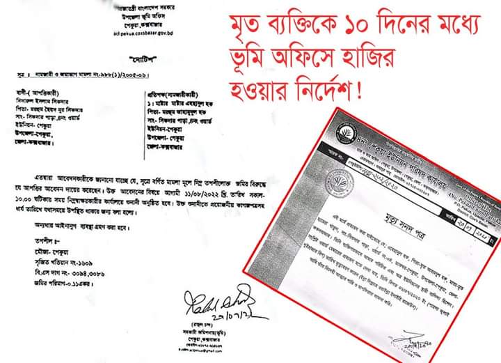 একজন মৃত ব্যক্তিকে ১০ দিনের মধ্যে কাগজপত্র নিয়ে উপজেলা ভূমি অফিসের শুনানীতে অংশ নেয়ার জন্য নোটিশ দেয়া হয়েছে। শুধু তাই নয় নোটিশ পেয়ে ওই মৃত ব্যক্তির বড় ছেলে ২ বছর আগে তার পিতার মৃত্যু হয়েছে জানিয়ে সময়ের আবেদন নিয়ে উপজেলা ভূমি সহকারী কমিশনারের কার্যালয়ে গেলে বিবাদী (মৃত ব্যক্তি) স্বশরীরে উপস্থিত না হওয়ায় আবেদনটি গ্রহণ করতেও অস্বীকৃতি জানায় ভূমি অফিসের প্রধান সহকারী। চাঞ্চল্যকর এ ঘটনাটি ঘটেছে পেকুয়া উপজেলা ভূমি সহকারী কমিশনারের কার্যালয়ে।