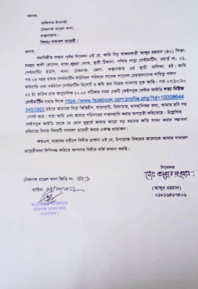 এই ফেইক আইডিটির বিরুদ্ধে টেকনাফ মডেল থানায় সাধারণ ডাইরী/জিডি করেছি। যাঁহার ডাইরি নং-৪৮৪/২২.