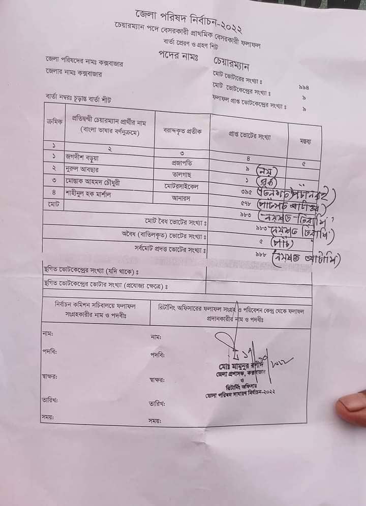 কক্সবাজার জেলা পরিষদ নির্বাচনের রিটার্নি অফিসার ও জেলা প্রশাসক মোঃ মামুনুর রশীদ স্বাক্ষরিত ফলাফল বিবরণীতে এ তথ্য জানা গেছে