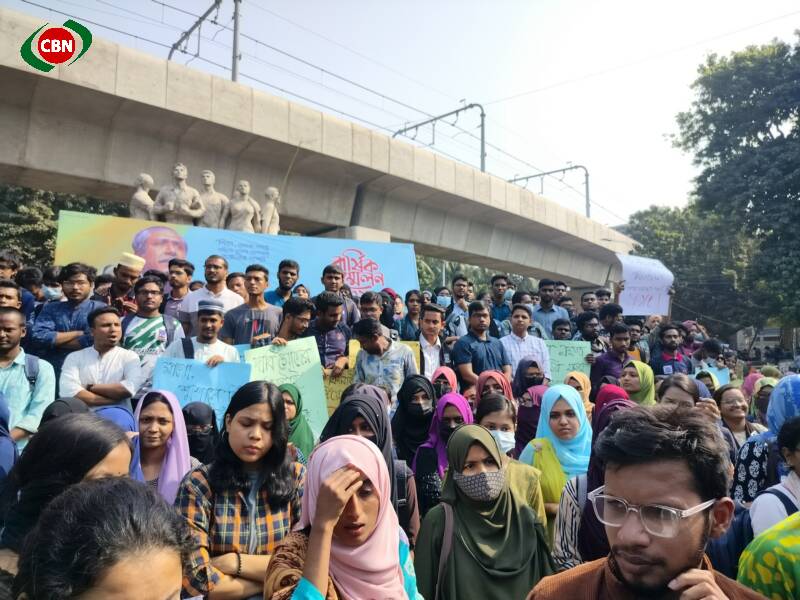 একই দাবিতে বিকেল সাড়ে চারটার দিকে ঢাকা বিশ্ববিদ্যালয়ের রাজু ভাস্কর্যের পাদদেশে মানববন্ধন করেন বামপন্থী ছাত্র গুলোর নবগঠিত জোট “গণতান্ত্রিক ছাত্রজোট” এর নেতাকর্মীরা।