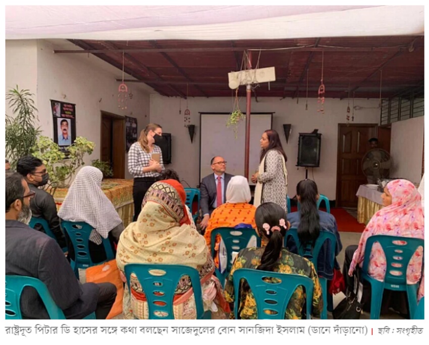 রাষ্ট্রদূত পিটার ডি হাসের সঙ্গে কথা বলছেন সাজেদুলের বোন সানজিদা ইসলাম (ডানে দাঁড়ানো)