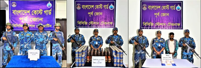 এছাড়া অপর আরেকটি অভিযানে বিসিজি স্টেশন টেকনাফ কর্তৃক টেকনাফ থানাধীন নাইট্যংপাড়ার নাফনদী সংলগ্ন প্যারাবন এলাকায় একটি অভিযান পরিচালনা করা হয়। অভিযান চলাকালীন একটি ডিঙি নৌকা নদীর তীরে ভিড়তে দেখা যায়। নৌকাটির গতিবিধি সন্দেহজনক মনে হলে কোস্টগার্ড সদস্য কর্তৃক থামার সংকেত দেওয়া হয়। এসময় নৌকায় থাকা মাঝি কোস্টগার্ডের উপস্থিতি বুঝতে পেরে নৌকাটি তীরে রেখে দ্রুত প্যারা বনের মধ্যে পালিয়ে যায়। পরবর্তীতে নৌকাটি তল্লাশি চালিয়ে ২১৩ ক্যান বিদেশী বিয়ার ও ৫০ বোতল মদ জব্দ করা হয়।