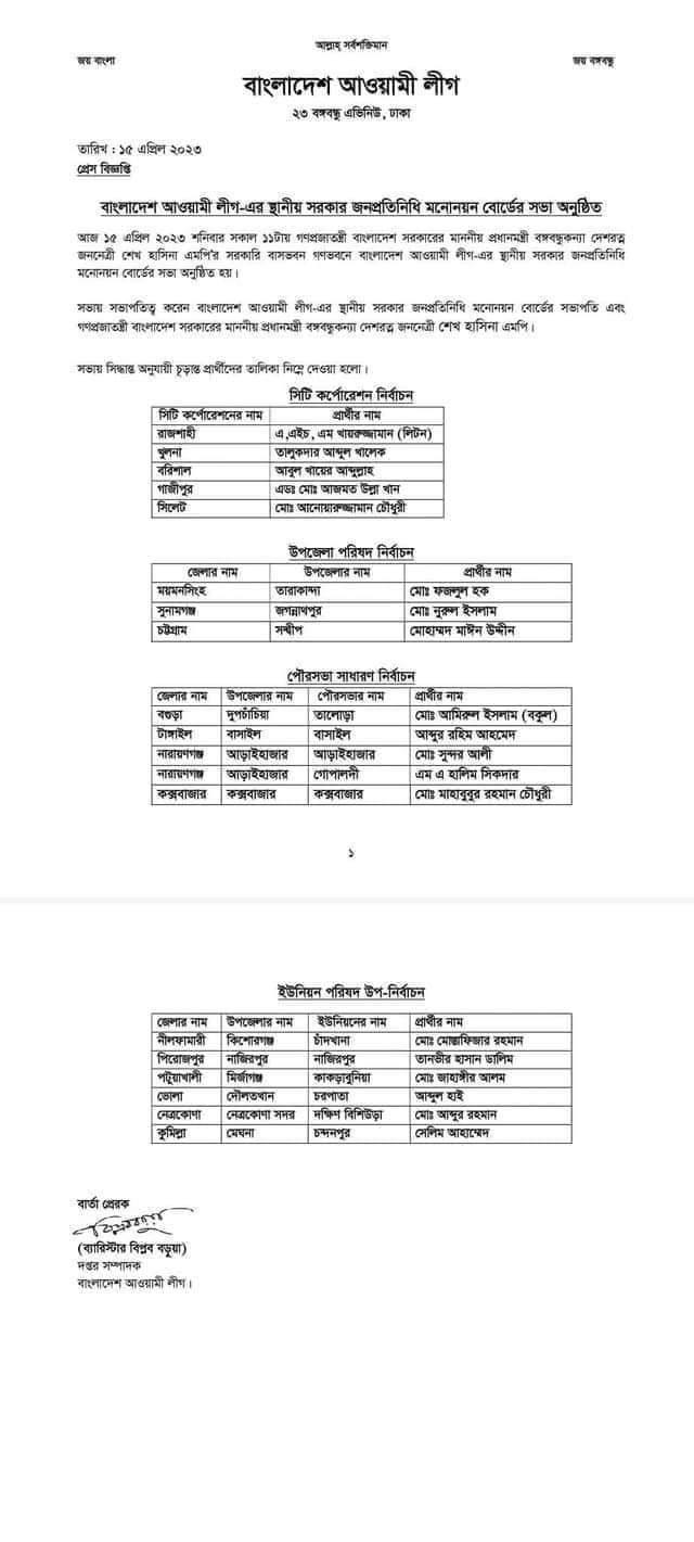 মনোনয়ন বোর্ড একইসাথে দেশের ৫ টি সিটি কর্পোরেশন, ৩ টি উপজেলা পরিষদ, ৫ টি পৌরসভা এবং ৬ টি ইউনিয়ন পরিষদের উপ নির্বাচনে আওয়ামী লীগের মনোনীত প্রার্থীর নাম ঘোষনা করেছেন।