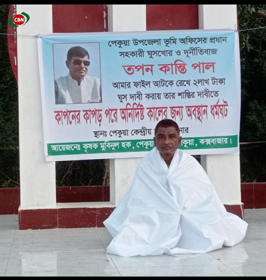 কক্সবাজার জেলার পেকুয়া উপজেলা ভূমি অফিসের প্রধান সহকারী তপন কান্তি পাল কর্তৃক জমি সংক্রান্ত এক কৃষকের ফাইল আটকিয়ে ২লাখ টাকা ঘুস দাবি করায় তার শাস্তির দাবিতে কাপনের কাপড় পরে শহীদ মিনারে অবস্থান ধর্মঘট পালন করেছেন ভূক্তভোগী এক কৃষক। আজ বৃহস্পতিবার ১১ মে বিকাল ৪টা থেকে সন্ধ্যা ৬ টা পর্যন্ত পেকুয়া কেন্দ্রীয় শহীদ মিনারে কাপনের কাপড় পরে অবস্থান ধর্মঘট পালন করেছেন পেকুয়া সদর ইউনিয়নের পূর্ব বাইম্যাখালী গ্রামের মৃত বরকত আলীর পুত্র কৃষক মুবিনুল হক (৫০)। কৃষক মুবিনুল হক গতকাল ১০মে সন্ধ্যায় পেকুয়ার স্থানীয় একটি প্রেস ক্লাবেও পেকুয়া উপজেলা ভূমি অফিসের প্রধান সহকারী তপনের অপসারণ দাবিতে সংবাদ সম্মেলন করেছিল। সংবাদ সম্মলেন করার পরেও ভূমি অফিসের কর্মচারী তপনের বিরুদ্ধে সংশ্লিষ্ট কর্তৃপক্ষ কোন ধরনের আইনগত ব্যবস্থা গ্রহণ না করায় আজ ১১মে পেকুয়া কেন্দ্রীয় শহীদ মিনারে তিনি কাপনের কাপড় পরে অবস্থান ধর্মঘট পালন করেছেন।
