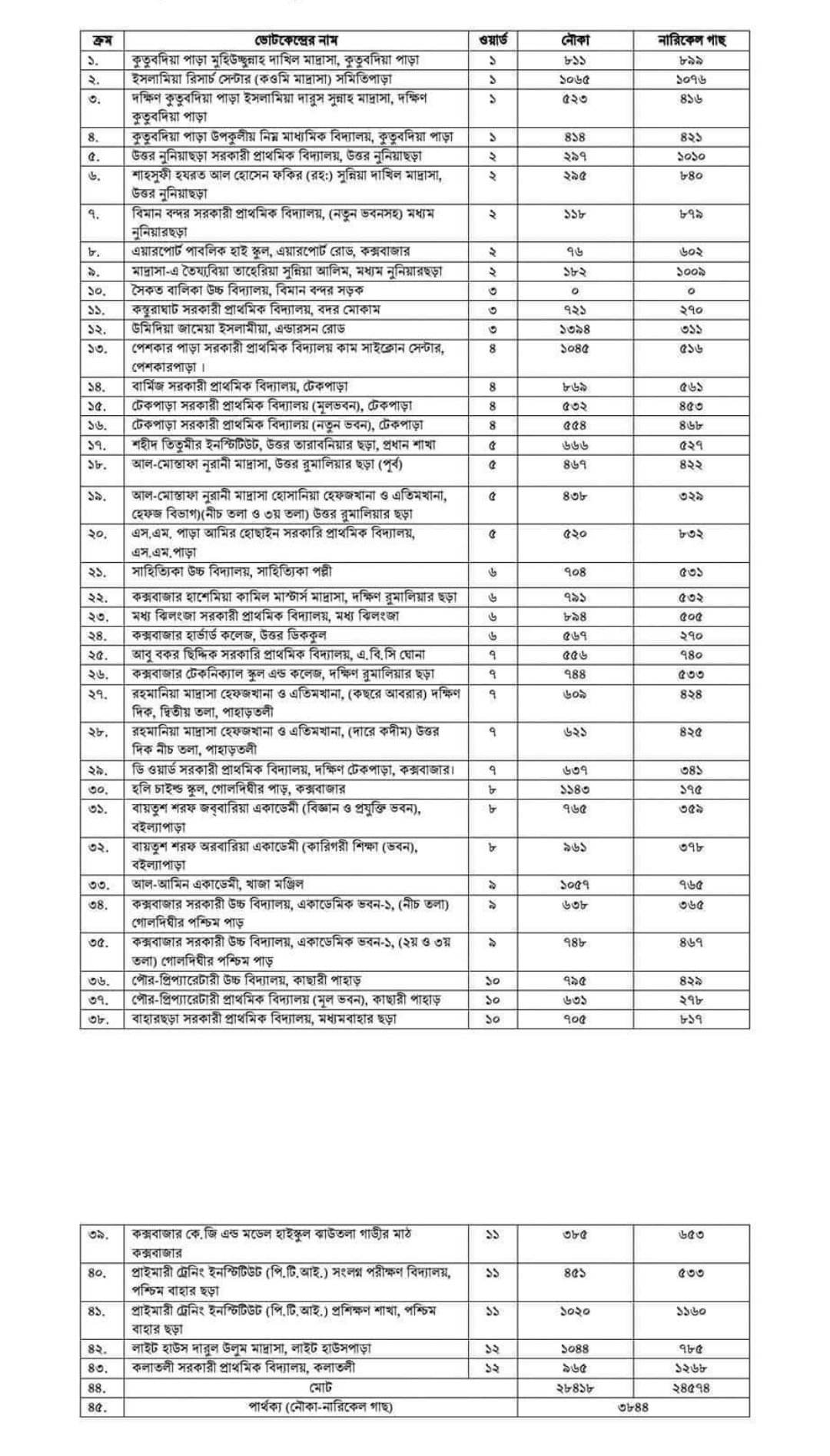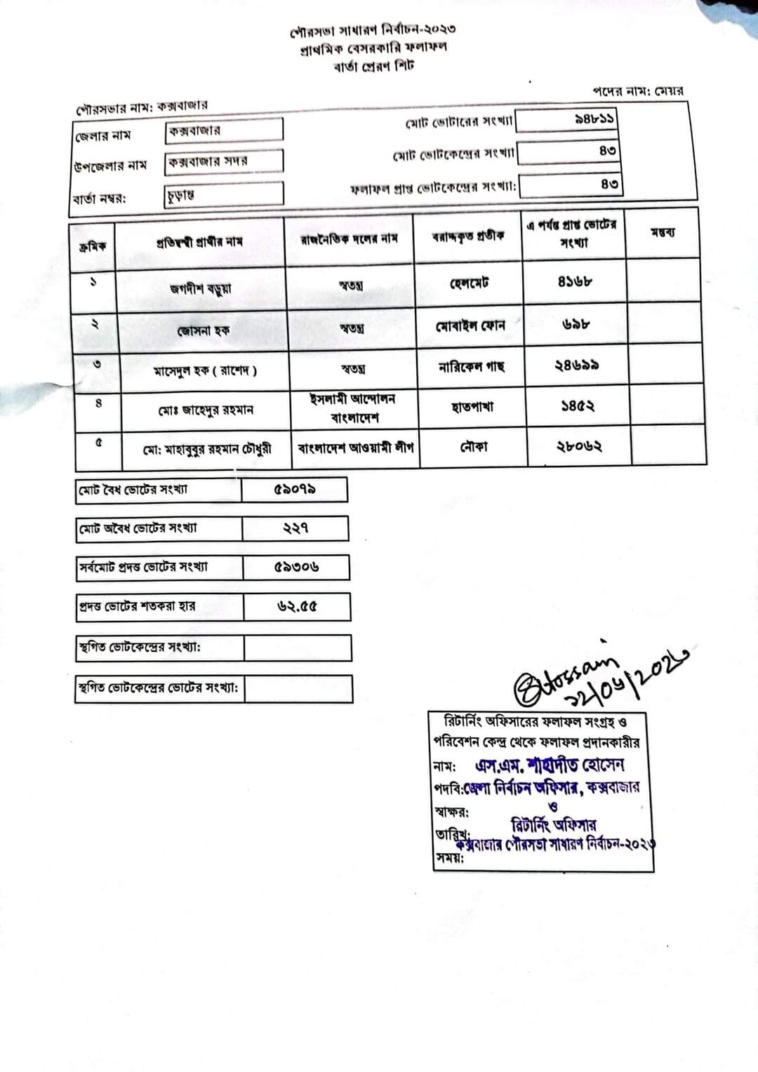 কক্সবাজার পৌরসভায় মোট ভোটার ৯৪ হাজার ৮১১ জন। ৪৩ টি ভোট কেন্দ্রে মোট কাস্টিং ভোট ৫৯ হাজার ৩০৬ টি। অবৈধ ভোটের সংখ্যা ২২৭ টি, মোট বৈধ ভোট ৫৯ হাজার ৭৯ টি। কাস্টিং ভোটের হার শতকরা ৬২’৫৫% ভাগ।