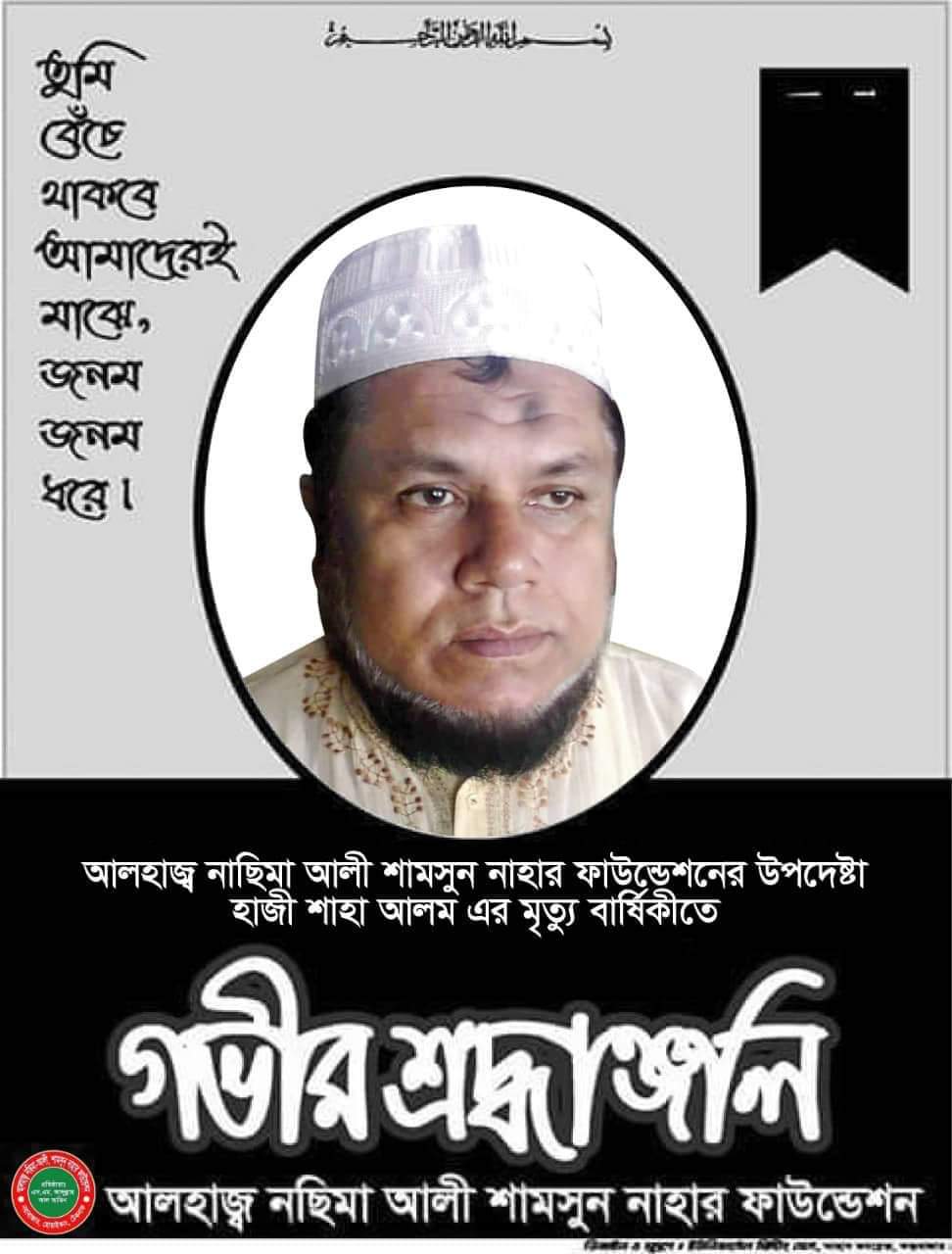 গভীর শ্রদ্ধা ও ভালবাসায় আমরা স্বরণ করছি তাকে আজ তাঁর ৩য় তম মৃত্যু বার্ষিকীতে আমরা জীবনের প্রতিটি পদক্ষেপে তাঁর অভাব অনুভব করছি। আত্মীয় – স্বজন – পরিচিতজন এবং শুভাকাংঙ্খীদের কাছে বিনীত অনুরোধ তারা যেন তাঁর জন্য প্রার্থনায় স্বরণ করে দোয়া করেন।তাঁর মৃত্যুবার্ষিকী উপলক্ষে তাঁর পরিবার ও আলহাজ্ব নছিমা আলী শামসুন নাহার ফাউন্ডেশন বিভিন্ন কর্মসূচি গ্রহণ করেছে।
