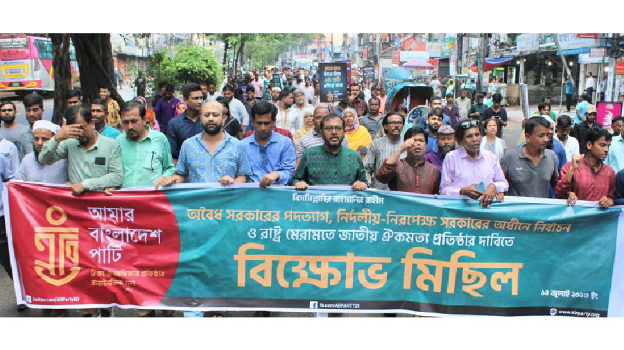 ক্ষমতাসীন আওয়ামী লীগ সরকারের পতনের দাবিতে বিক্ষোভ মিছিল-সমাবেশ করেছে আমার বাংলাদেশ (এবি) পার্টি। শুক্রবার (১৪ জুলাই) বিকালে বৃষ্টি মাথায় নিয়েই পার্টির কেন্দ্রীয় কার্যালয়ের সামনে বিজয় একাত্তর চত্বরে সমাবেশ করে দলটি।