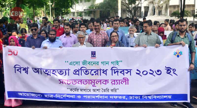ঢাকা বিশ্ববিদ্যালয়ে আজ ১০ সেপ্টেম্বর ২০২৩ রবিবার বিশ্ব আত্মহত্যা প্রতিরোধ দিবস-২০২৩ পালিত হয়েছে। দিবসটি উপলক্ষ্যে বিশ্ববিদ্যালয়ের উপাচার্য অধ্যাপক ড. মো. আখতারুজ্জামানের নেতৃত্বে অপরাজেয় বাংলার পাদদেশ থেকে ক্যাম্পাসে এক সচেতনতামূলক র‌্যালি বের করা হয়। ছাত্র-নির্দেশনা ও পরামর্শদান দফতর এই র‌্যালির আয়োজন করে। এবছর দিবসটির প্রতিপাদ্য হচ্ছে ‘কর্মের মাধ্যমে আশা তৈরি করি’।