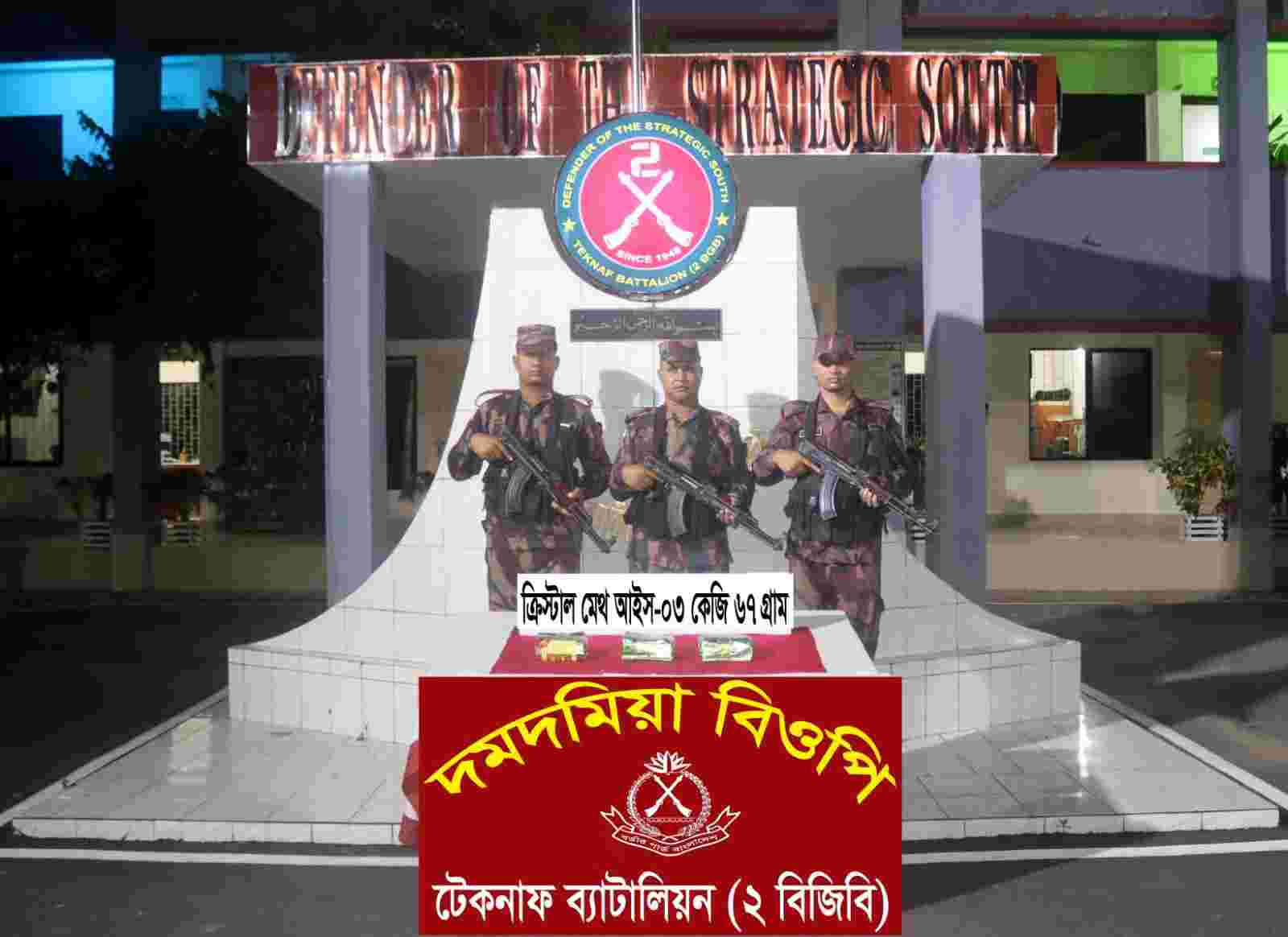 তিনি জানান, দমদমিয়া সীমান্ত দিয়ে মিয়ানমার থেকে মাদকের একটি বড় চালান বাংলাদেশে ঢুকতে পারে- এমন গোপন সংবাদের ভিত্তিতে দমদমিয়া বিজিবির টহল দলের সদস্যরা নাফ নদ সীমান্ত এলাকার কেওড়া বাগানে অবস্থান নেয়। পরে টহল দল রাতে দুইজন ব্যক্তিকে একটি প্লাস্টিকের বস্তা নিয়ে কেওড়া বাগানের দিকে আসতে দেখে। পরে মাদক কারবারিরা বিজিবির উপস্থিতি টের পেয়ে কেওড়া বাগানের ভিতরে প্লাস্টিকের বস্তাটি ফেলে রাতের আধারে পাহাড়ের দিকে লুকিয়ে যায়। পরবর্তীতে টহল দল কেওড়া বাগানে তল্লাশি করে একটি প্লাস্টিকের বস্তার ভেতর থেকে ৩ কেজি ৬৭ গ্রাম ক্রিস্টাল মেথ আইস উদ্ধার করে।