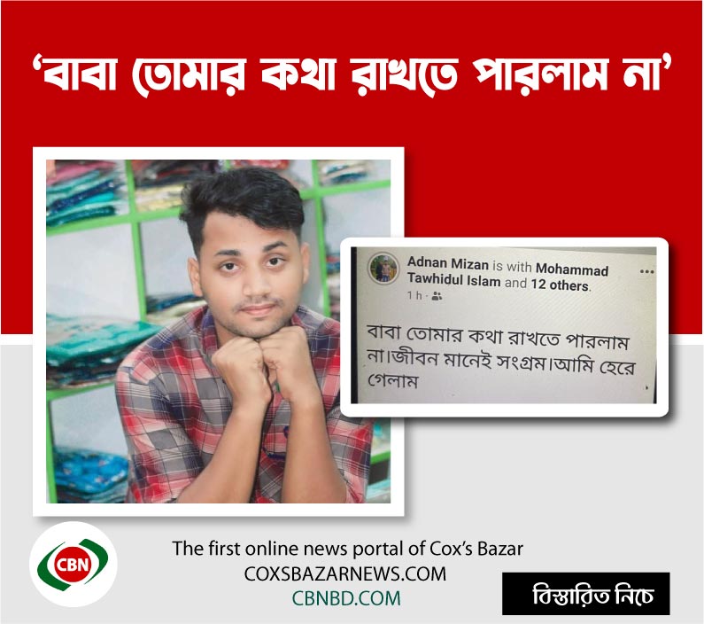 বাবা তোমার কথা রাখতে পারলাম না, জীবন মানে সংগ্রাম, আমি হেরে গেলাম এবং পারলে ক্ষমা কবরেন, স্বপ্নগুলো পুরণ হলোনা এমন দুইটি ফেসবুক পোষ্ট দিয়ে মিজানুর রহমান নামে এক যুবক গলায় ফাঁস দিয়ে আত্মহত্যা করেছে।