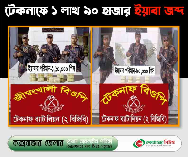 অপরদিকে,একইদিনে বিজিবি’র টেকনাফ ২বিজিবি ব্যাটালিয়ন এর অধীনস্থ টেকনাফ বিওপি’র টহলদল তাদের দায়িত্বপূর্ণ হ্যাচারখাল নামক এলাকায় মাদকবিরোধী অভিযান পরিচালনা করে ৮০ হাজার পিস ইয়াবা জব্দ করতে সক্ষম হয়েছে।