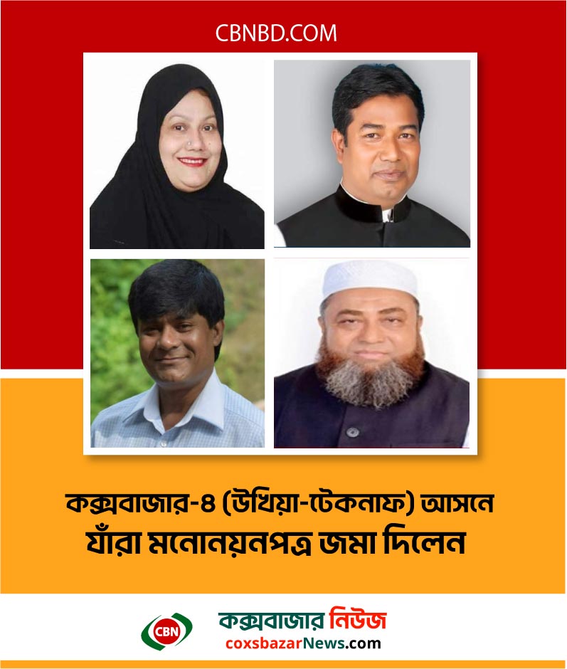 কক্সবাজার-৪ (উখিয়া-টেকনাফ) আসনে মনোনয়নপত্র দাখিলকারী ৯ জন প্রার্থী হলেন-আওয়ামীলীগের শাহীন আকতার, জাতীয় পার্টির নুরুল আমিন সিকদার ভূট্টো, স্বতন্ত্র সোহেল আহমেদ বাহাদুর, তৃনমূল বিএনপি’র মুজিবুল হক মুজিব, ইসলামী ঐক্যজোটের ওসমান গনি চৌধুরী, স্বতন্ত্র মোহাম্মদ ইসহাক, এনপিপি’র ফরিদ আলম, স্বতন্ত্র নুরুল বশর ও বাংলাদেশ কংগ্রেসের মোহাম্মদ ইসমাইল।