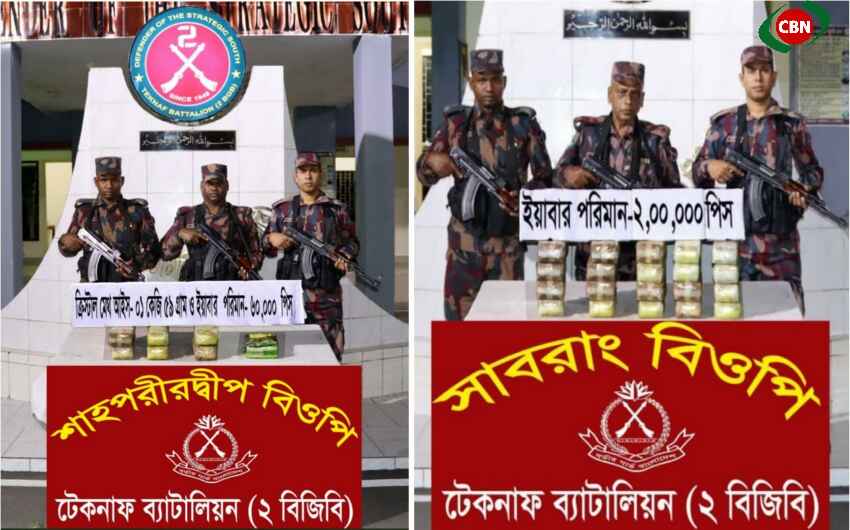 এছাড়া অপরদিকে একইদিনে গোপন সংবাদের ভিত্তিতে টেকনাফ ২বিজিবি ব্যাটালিয়ন এর অধীনস্থ শাহপরীরদ্বীপ বিওপি’র দায়িত্বপূর্ণ বিআরএম-৪ থেকে আনুমানিক ৫০০ গজ দক্ষিণ-পূর্ব দিকে জালিয়াপাড়া নামক এলাকা দিয়ে মাদকের একটি চালান মিয়ানমার থেকে বাংলাদেশে আসতে পারে। এমন সংবাদের ভিত্তিতে শাহপরীরদ্বীপ বিওপি’র চোরাচালান প্রতিরোধ টহলদল বর্ণিত এলাকায় গমন করে কয়েকটি উপদলে বিভক্ত হয়ে বেড়ীবাঁধ এবং জিও ব্যাগের আঁড় নিয়ে কৌশলগত অবস্থান গ্রহণ করে। কিছুক্ষণ পর পূর্ব থেকেই কৌশলগত অবস্থানে থাকা বিজিবি টহলদল একজন ব্যক্তিকে নাফনদী পার হয়ে একটি প্লাস্টিকের ব্যাগ হাতে নিয়ে সীমান্তের শূণ্য লাইন থেকে আনুমানিক ১.৫ কিলোমিটার বাংলাদেশের অভ্যন্তরে জালিয়াপাড়া এলাকায় বেড়ীবাঁধের দিকে আসতে দেখে। তার গতিবিধি সন্দেহজনক পরিলক্ষিত হওয়ায় টহলদল তাকে চ্যালেঞ্জ করলে বিজিবি টহলদলের উপস্থিতি টের পেয়ে উক্ত ব্যক্তি দ্রুত দৌড়ে পালিয়ে যাওয়ার সময় তার হাতে থাকা ব্যাগটি মাটিতে পড়ে যায় এবং চোরাকারবারী রাতের অন্ধকারের সুযোগে পার্শ্ববর্তী গ্রামের ভিতরে পালিয়ে যায়। পরবর্তীতে টহলদল উল্লেখিত স্থানে পৌঁছে তল্লাশী অভিযান পরিচালনা করে চোরাকারবারীর ফেলে যাওয়া ১টি প্লাস্টিকের ব্যাগের ভিতর থেকে ১ কেজি ৫৯ গ্রাম ক্রিস্টাল মেথ আইস এবং ৬০ হাজার পিস ইয়াবা ট্যাবলেট উদ্ধার করতে সক্ষম হয়।