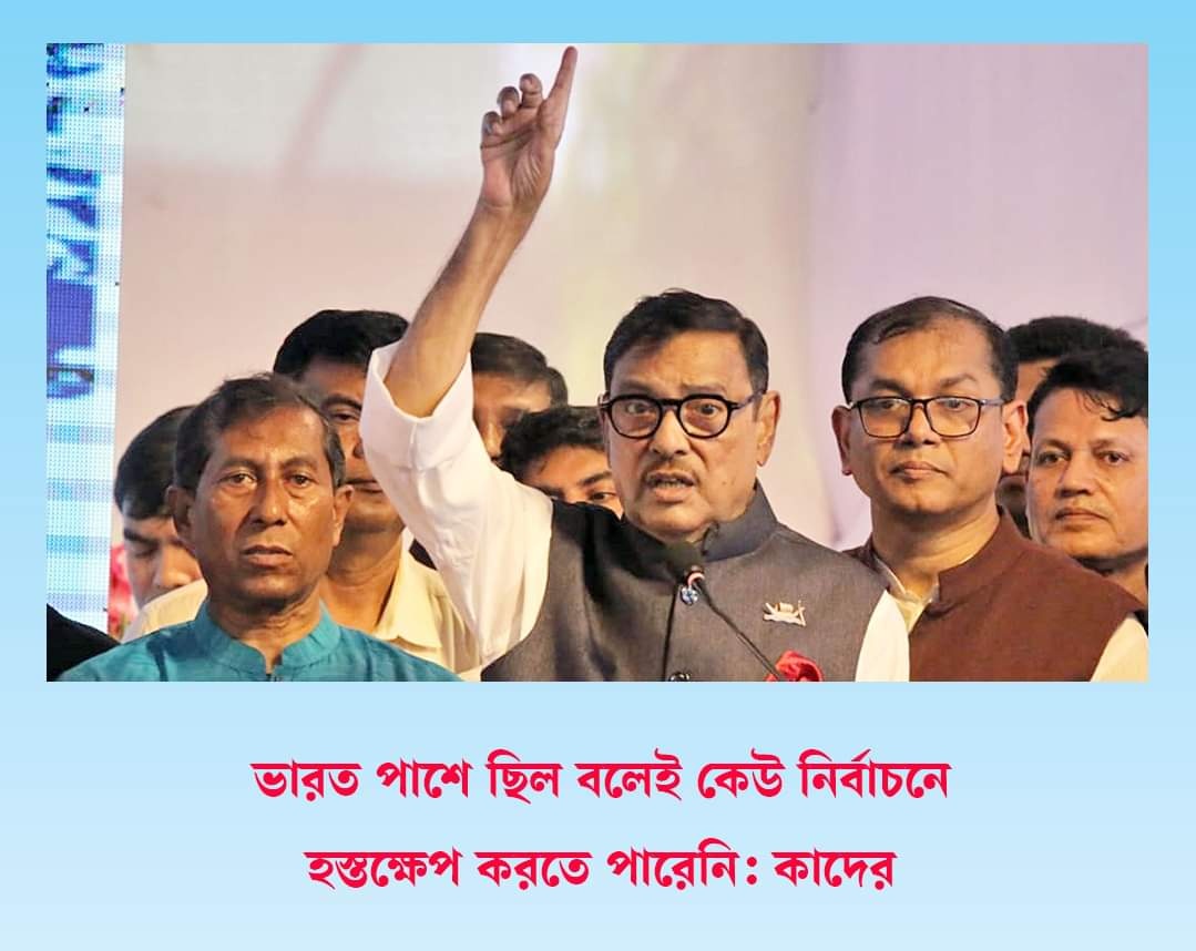আওয়ামী লীগের সাধারণ সম্পাদক এবং সড়ক পরিবহন ও সেতুমন্ত্রী ওবায়দুল কাদের বলেছেন, ভারত পাশে ছিল বলেই বাংলাদেশের নির্বাচনে বিশ্বের বড় বড় রাষ্ট্র অশুভ হস্তক্ষেপ করতে পারেনি।