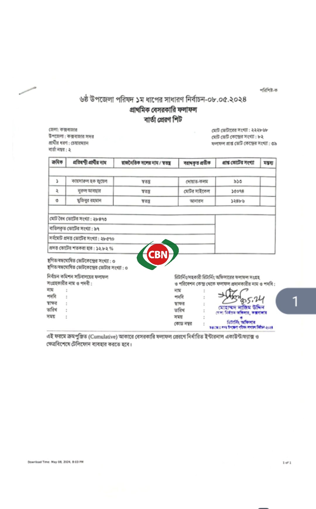 বেসরকারিভাবে চেয়ারম্যান নির্বাচিত হয়েছেন। তাঁর নিকটতম প্রতিদ্বন্দ্বী কক্সবাজার জেলা আওয়ামী লীগের সাধারণ সম্পাদক মুজিবুর রহমান আনারস প্রতীক নিয়ে পেয়েছেন ২৬ হাজার ৫৫ ভোট। ২ জনের ভোটের ব্যবধান ৮ হাজার ৯১৯ ভোট। নির্বাচন থেকে সরে গিয়েও দোয়াত কলম প্রতীক নিয়ে কায়সারুল হক জুয়েল পেয়েছেন ২ হাজার ১২৬ ভোট। রিটার্নিং অফিসার ও জেলা নির্বাচন অফিসার মোহাম্মদ নাজিম উদ্দিন এ তথ্য জানিয়েছেন।