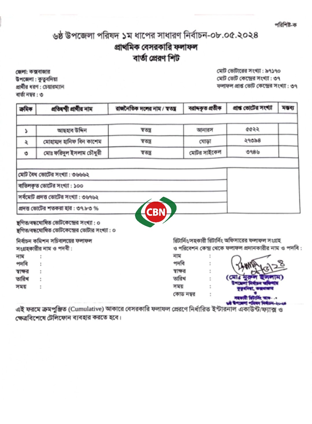 কুতুবদিয়া উপজেলা পরিষদের নির্বাচনে ৩৭ টি ভোট কেন্দ্রে ঘোড়া প্রতীক নিয়ে চেয়ারম্যান পদপ্রার্থী মোহাম্মদ হানিফ বিন কাশেম ২৭ হাজার ৩৪৯ ভোট পেয়ে বেসরকারিভাবে চেয়ারম্যান নির্বাচিত হয়েছেন। তাঁর নিকটতম প্রতিদ্বন্দ্বী আছহাব উদ্দিন আনারস প্রতীক নিয়ে পেয়েছেন ৫ হাজার ৫২২ ভোট। ২ জনের ভোটের ব্যবধান ২১ হাজার ৮৭২ ভোট। চেয়ারম্যান পদে মটর সাইকেল প্রতীকের প্রার্থী অ্যাডভোকেট মোঃ ফরিদুল ইসলাম চৌধুরী ৩ হাজার ৭৪৬ ভোট পেয়ে তৃতীয় হয়েছেন। চেয়ারম্যান পদে বিজয়ী মোহাম্মদ হানিফ বিন কাশেম অ্যাডভোকেট ফরিদুল ইসলাম চৌধুরীর ভ্রাতুষ্পুত্র।