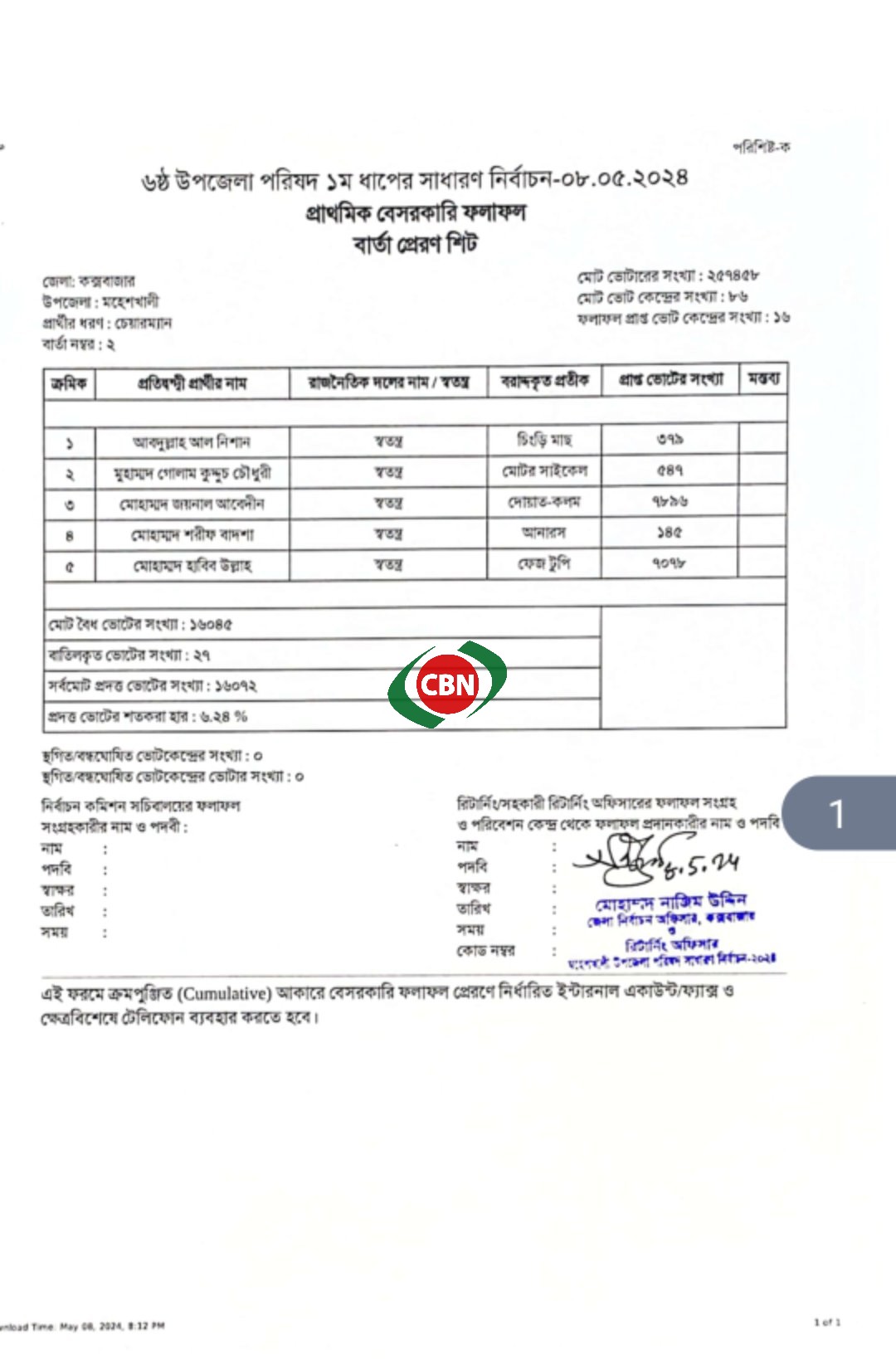 মহেশখালী উপজেলা পরিষদের নির্বাচনের রিটার্নিং অফিসার এ তথ্য জানিয়েছেন। মহেশখালী উপজেলা পরিষদের নির্বাচনে চেয়ারম্যান পদে অন্যান্য প্রার্থীদের মধ্যে মটর সাইকেল প্রতীক নিয়ে মুহাম্মদ গোলাম কুদ্দুস চৌধুরী পেয়েছেন ৫৪৭ ভোট, চিংড়ি মাছ প্রতীকের আবদুল্লাহ আল নিশান পেয়েছেন ৩৭৯ ভোট এবং আনারস প্রতীক নিয়ে মোহাম্মদ শরীফ বাদশা পেয়েছেন ১৪৫ ভোট।