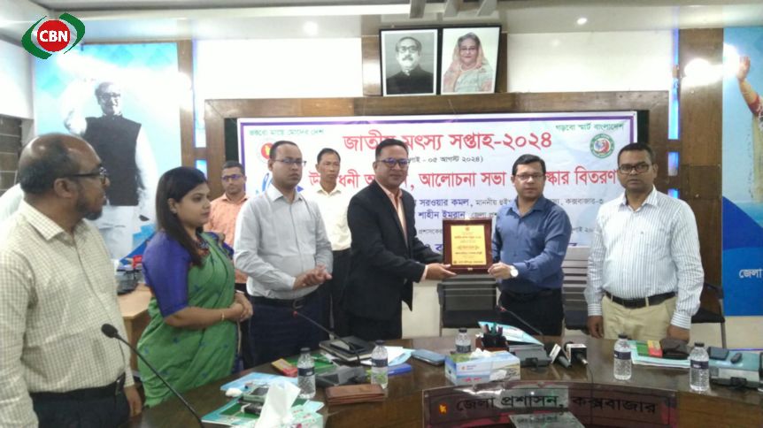 বুধবার (৩১ জুলাই) জাতীয় মৎস্য সপ্তাহ—২০২৪ উপলক্ষ্যে আয়োজিত অনুষ্ঠানে গ্রীন হাউজ মেরি কালচার এর ব্যবস্থাপনা পরিচালক মো. মাহমুদুল হককে সম্মাননা স্মারক তুলে দেন জেলা প্রশাসক মুহম্মদ শাহীন ইমরান।