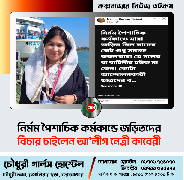 চলমান কোটা সংস্কার আন্দোলন ঘিরে সংঘাত সংঘর্ষের বিষয়ে এবার প্রকাশ্যে মুখ খুললেন কক্সবাজার জেলা আওয়ামী লীগের সাবেক সাংগঠনিক সম্পাদক নাজনীন সরওয়ার কাবেরী। হত্যাকাণ্ডে জড়িতদের বিচার দাবির পাশাপাশি আন্দোলনকারী ছাত্রদের বিরুদ্ধে দায়েরকৃত মামলাও প্রত্যাহার চেয়েছেন তিনি।