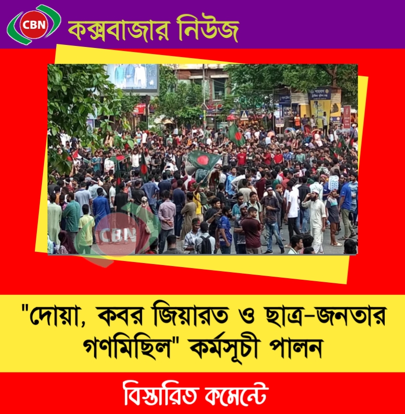 কর্মসূচি: গণহত্যা ও গণগ্রেফতারের প্রতিবাদে এবং শিক্ষার্থীদের ৯দফা দাবি আদায়ের লক্ষ্যে আগামীকাল সারাদেশে মসজিদে জুমার নামাজ শেষে দোয়া মোনাজাত, মন্দির, গির্জা সহ সকল প্রার্থনালয়ে প্রার্থনার আয়োজন, ও জুমার নামাজ শেষে শহিদদের কবর জিয়ারত ও ছাত্র-জনতার গণমিছিল অনুষ্ঠিত হবে।