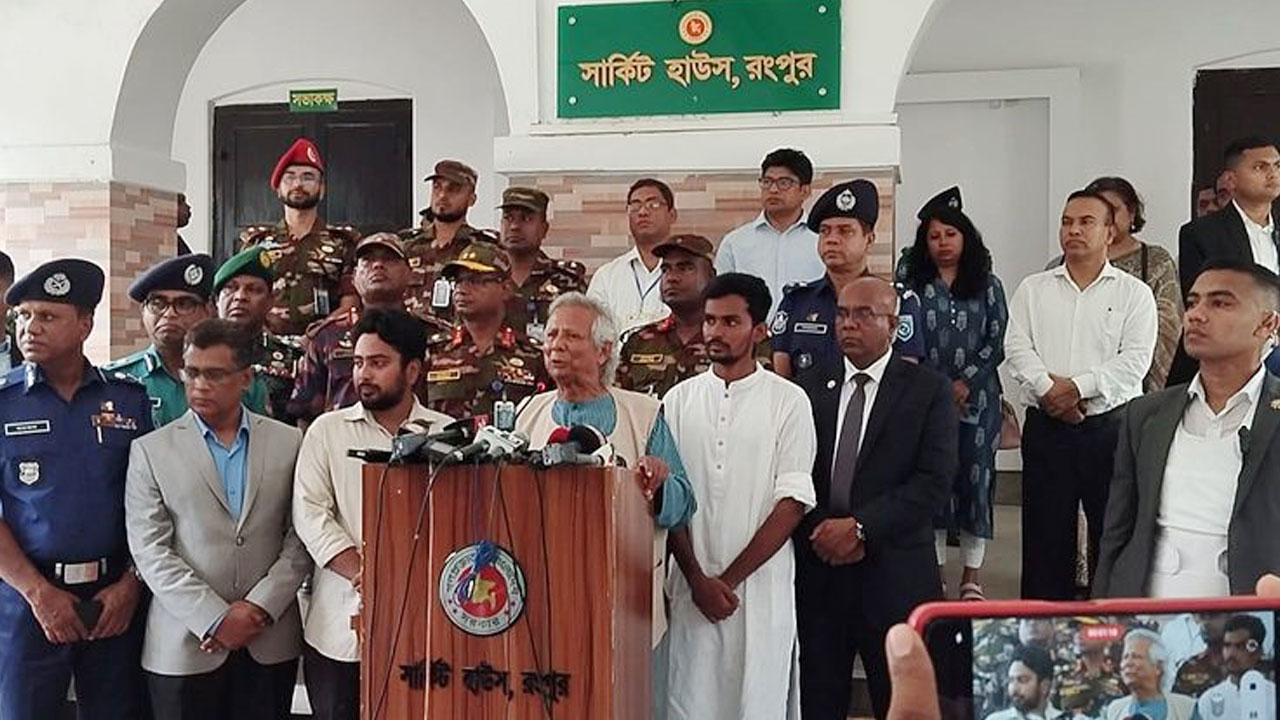এর আগে শনিবার (১০ আগস্ট) সকালে হেলিকপ্টারযোগে রংপুরের পীরগঞ্জে আসেন ড. মুহাম্মদ ইউনূস। সেখানে জাফরপাড়ায় আবু সাঈদের বাড়িতে গিয়ে তার কবর জিয়ারত করে পরিবারের সদস্যদের খোঁজখবর নেন। পরে সেখান থেকে তিনি আসেন বেগম রোকেয়া বিশ্ববিদ্যালয়ে। সেখানে বৈষম্যবিরোধী ছাত্র আন্দোলনের সমন্বয়কসহ শিক্ষার্থীদের সঙ্গে মতবিনিময় করেন। পরে আহতদের দেখতে রংপুর মেডিকেল কলেজ (রামেক) হাসপাতালে যান। এরপর রংপুর সার্কিট হাউসে তিনি সাংবাদিকদের সঙ্গে কথা বলেন।