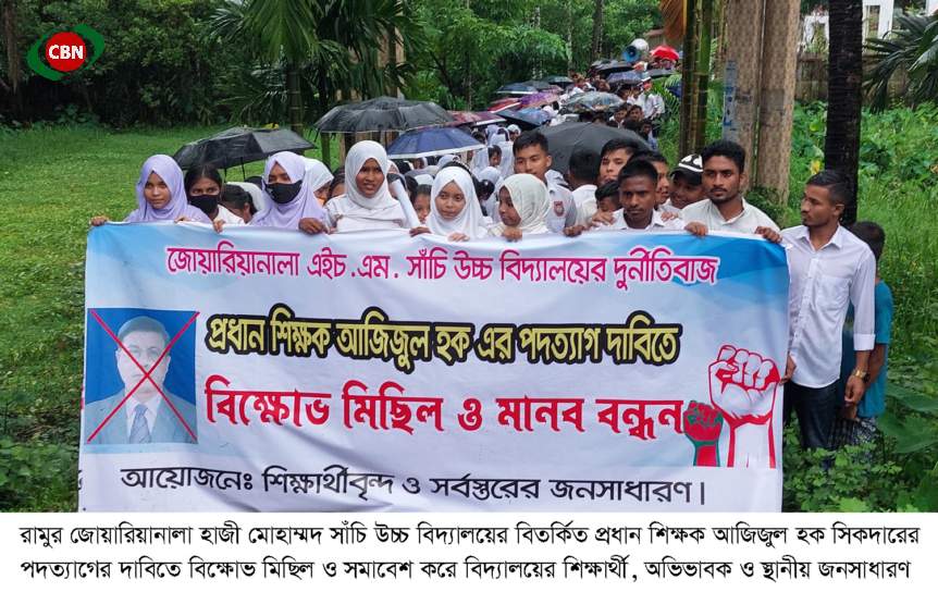 কক্সবাজারের রামু উপজেলার ঐহিত্যবাহী শিক্ষা প্রতিষ্ঠান জোয়ারিয়ানালা হাজী মোহাম্মদ সাঁচি উচ্চ বিদ্যালয়ের বিতর্কিত প্রধান শিক্ষক আজিজুল হক সিকদারের পদত্যাগের দাবিতে বিক্ষোভ সমাবেশ ও মিছিল অনুষ্ঠিত হয়েছে। রবিবার, ১৮ আগস্ট সকালে বিদ্যালয় মাঠে অনুষ্ঠিত সমাবেশে বিদ্যালয়ের শিক্ষার্থী ও স্থানীয় জনসাধারণ এ বিক্ষোভ সমাবেশে অংশ নেয়।