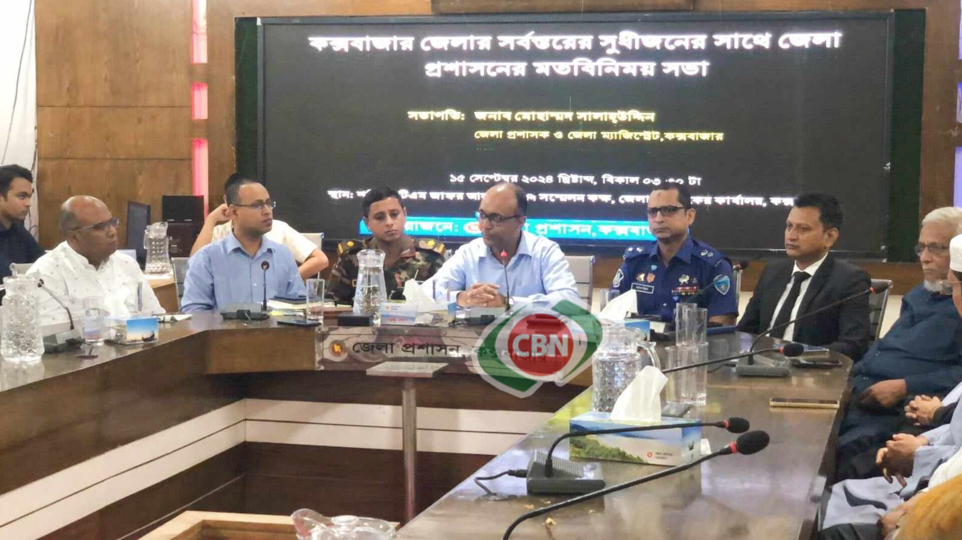 অতিরিক্ত জেলা প্রশাসক (সার্বিক) মো. ইয়ামিন হোসেনের সঞ্চালনায় মতবিনিময় সভায় পুলিশ সুপার মুহাম্মদ রহমত উল্লাহ, বিএনপির কেন্দ্রীয় মৎস্যজীবী বিষয়ক সম্পাদক লুৎফুর রহমান কাজল, জেলা বিএনপির সভাপতি শাহজাহান চৌধুরী, জেলা জামায়াতের আমীর অধ্যক্ষ মাওলানা নুর আহমদ আনোয়ারী, সাধারণ সম্পাদক এডভোকেট ফরিদ উদ্দিন ফারুকী, কক্সবাজার জেলা বারের সভাপতি এডভোকেট আবুল কালাম সিদ্দিকী, জেলা বিএনপির সাধারণ সম্পাদক এডভোকেট শামীম আরা স্বপ্না, কক্সবাজার প্রেসক্লাবের সভাপতি মাহবুবর রহমান, সাধারণ সম্পাদক মমতাজ উদ্দিন বাহারী, কক্সবাজার চেম্বারের সভাপতি আবু মোর্শেদ চৌধুরী, হোটেল মোটেল গেস্ট হাউস মালিক সমিতির সভাপতি আবুল কাশেম সিকদার, ট্যুর অপারেটর ওনার্স এসোসিয়েশনের সাবেক সভাপতি এম রেজাউল করিম, টুয়াক সভাপতি আনোয়ার কামাল, ছাত্র প্রতিনিধি মোহাম্মদ শাহেদ, জিনিয়াসহ বিভিন্ন স্তরের প্রতিনিধিবৃন্দ বক্তব্য রাখেন।