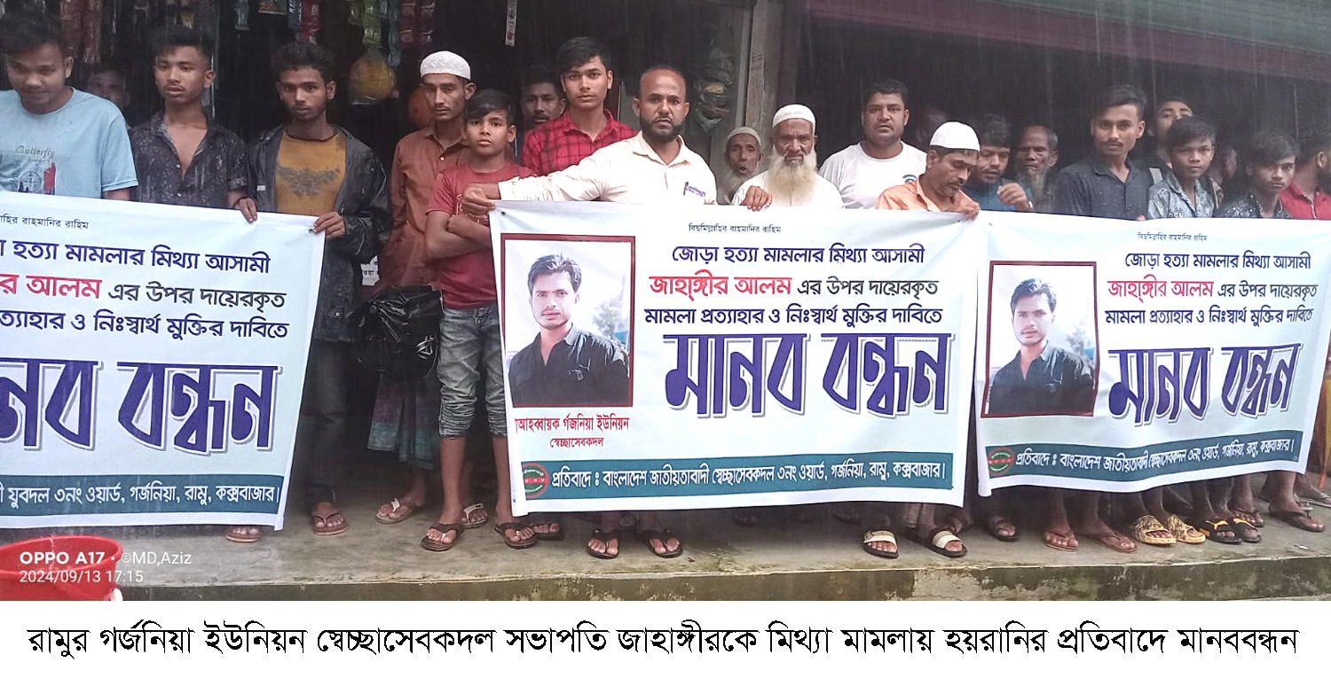 কক্সবাজারের রামু উপজেলার গর্জনিয়ায় আলোচিত জোড়া হত্যার ঘটনায় গর্জনিয়া ইউনিয়ন স্বেচ্ছাসেবক দলের সভাপতি জাহাঙ্গীর আলমকে জড়িয়ে হয়রানির প্রতিবাদে মানববন্ধন ও প্রতিবাদ সমাবেশ অনুষ্ঠিত হয়েছে। শুক্রবার, ১৩ সেপ্টেম্বর বিকালে গর্জনিয়া থোয়াইগ্যাকাটা স্টেশন চত্বরে এ মানববন্ধন ও প্রতিবাদ সমাবেশের আয়োজন করে বাংলাদেশ জাতীয়তাবাদী স্বেচ্ছাসেবক দল গর্জনিয়া ৩ নং ওয়ার্ড শাখার নেতৃবৃন্দ।