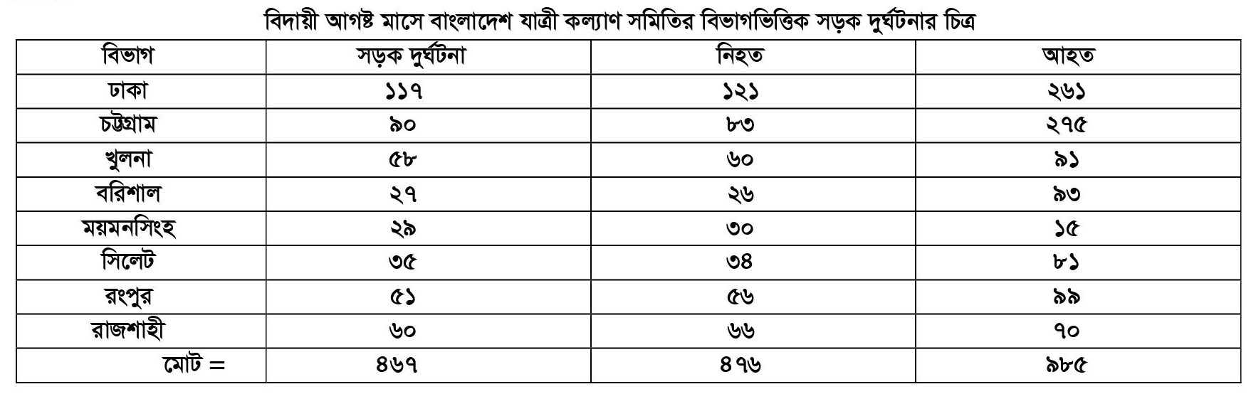 বিদায়ী আগস্ট মাসে দেশের গণমাধ্যমের তথ্যমতে, ৪৬৭ টি সড়ক দুর্ঘটনায় ৪৭৬ জন নিহত, ৯৮৫ জন আহতের তথ্য পাওয়া গেছে। এই মাসে রেলপথে ১০ টি দুর্ঘটনায় ০৮ জন নিহত, ০২ জন আহত হয়েছে। নৌ পথে ১৩ টি দুর্ঘটনায় ৫০ জন নিহত, ০২ জন আহত এবং ০৯ জন নিখোঁজ রয়েছে। সড়ক, রেল ও নৌ-পথে সর্বমোট ৪৯০ টি দুর্ঘটনায় ৫৩৪ জন নিহত এবং ৯৮৯ জন আহত হয়েছে। এই সময়ে ১৯৩ টি মোটরসাইকেল দুর্ঘটনায় ২০৬ জন নিহত, ২০১ জন আহত হয়েছে। যা মোট দুর্ঘটনার ৪১.৩২ শতাংশ, নিহতের ৪৩.২৭ শতাংশ ও আহতের ২০.৪০ শতাংশ। এই মাসে সবচেয়ে বেশি সড়ক দুর্ঘটনা সংগঠিত হয়েছে ঢাকা বিভাগে ১১৭ টি সড়ক দুর্ঘটনায় ১২১ জন নিহত ও ২৬১ জন আহত হয়েছে, সবচেয়ে কম সড়ক দুর্ঘটনা সংগঠিত হয়েছে বরিশাল বিভাগে ২৭ টি সড়ক দুর্ঘটনায় ২৬ জন নিহত ও ৯৩ জন আহত হয়েছে। বাংলাদেশ যাত্রী কল্যাণ সমিতির দুর্ঘটনা মনিটরিং সেলের পর্যবেক্ষণ প্রতিবেদনে এই তথ্য উঠে এসেছে।