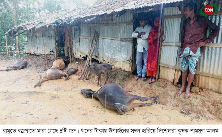 কক্সবাজারের রামুতে আকস্মিক বজ্রপাতে দরিদ্র কৃষকের ৪টি গরু মারা গেছে। উপার্জনের একমাত্র সম্বল গরুগুলো হারিয়ে হতবাক হয়ে পড়েছেন ওই কৃষক। মৃতগরুগুলোর পাশে আহাজারি করতেও দেখা গেছে ওই পরিবারের সদস্যদের। রবিবার, ২২ সেপ্টেম্বর দিবাগত রাত রামু উপজেলার জোয়ারিয়ানালা ইউনিয়নের ৮ নং ওয়ার্ডের পূর্বপাড়া এলাকায় এ ঘটনা ঘটে। ক্ষতিগ্রস্ত কৃষক শামসুল আলম ওই এলাকার মৃত বাঁচা মিয়ার ছেলে।