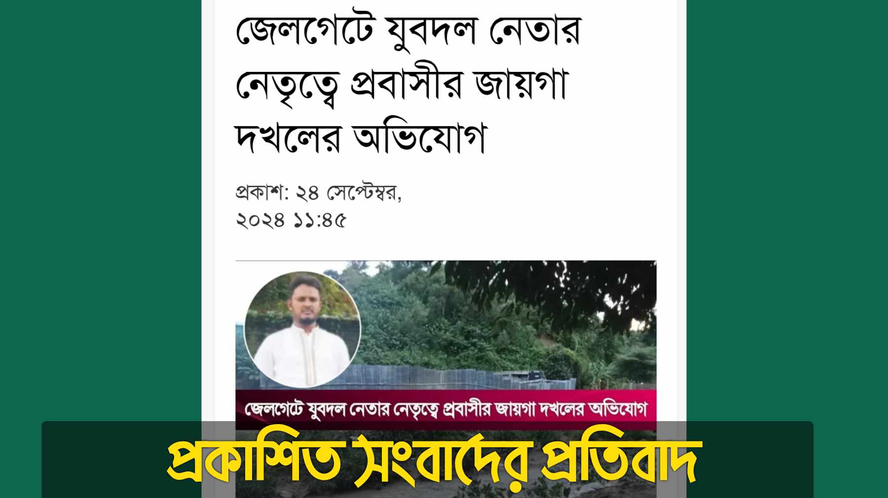 দেশের শুদ্ধি অভিযান ও সংস্কারের এই ক্রান্তিলগ্নে অন্তর্বর্তীকালীন সংকারকে ও বিএনপিকে কলুষিত ও বেকায়দায় ফেলার জন্য কতিপয় ব্যক্তি যে সব পদক্ষেপ নিয়েছে তারই ষড়যন্ত্রের অংশ বিশেষ উল্লেখিত সংবাদটি। প্রকাশিত সংবাদের উল্লেখিত বিগত ২১/০৩/২০২১ ইং তারিখে ১৩৭৭/২১ ইং রেজিষ্ট্রার্ড দলিলের উল্লেখিত জমির চেয়ে জনৈক খোরশেদ আলম তৎকালীন আওয়ামী লীগ সরকারের ক্ষমতার অপব্যবহার করে তার চেয়ে অনেক বেশী অন্যের জায়গা ঘেরা দিয়ে দখলে রেখেছেন। অথচ দাগ নং,