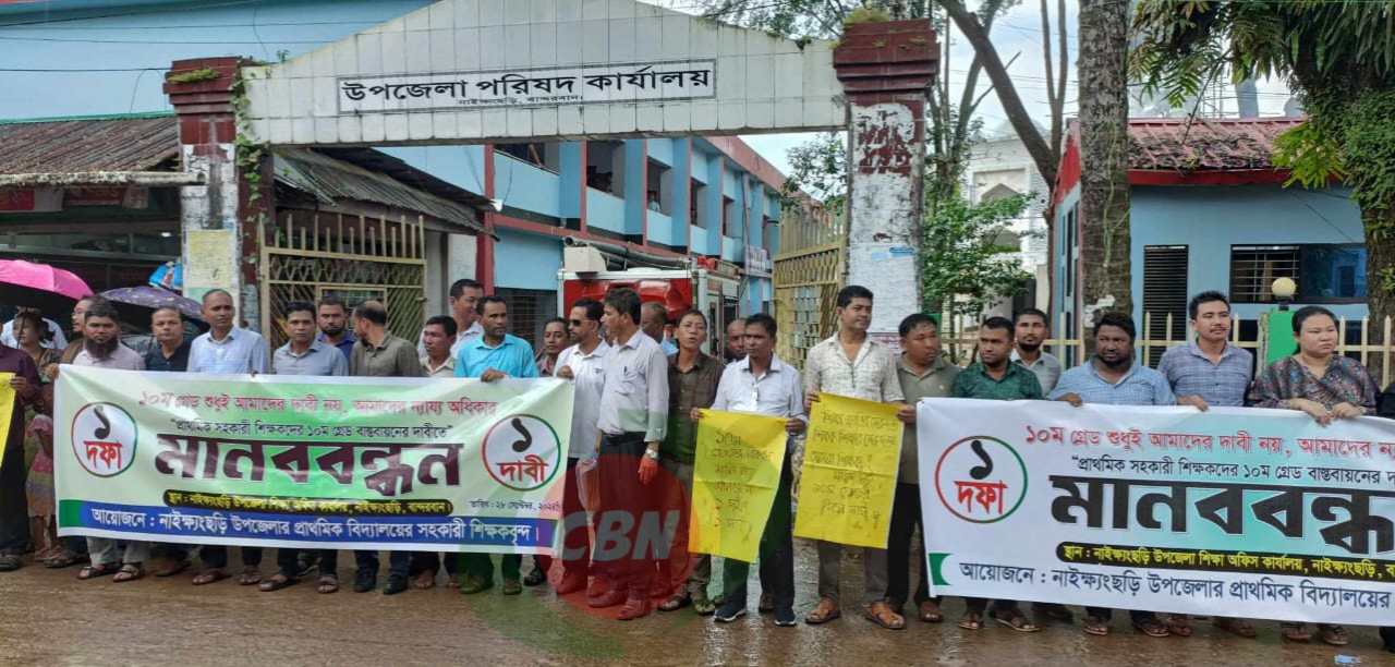 শনিবার (২৮ সেপ্টেম্বর) সকাল ১১ টার সময় নাইক্ষ্যংছড়ি উপজেলার সরকারি প্রাথমিক বিদ্যালয়ের সহকারী শিক্ষকদের বেতন ১০ম গ্রেড বাস্তবায়নের দাবিতে উপজেলার বিভিন্ন প্রাথমিক বিদ্যালয়ের শিক্ষক-শিক্ষিকাবৃন্দ মানববন্ধন ও স্মারকলিপি প্রদান করেন।