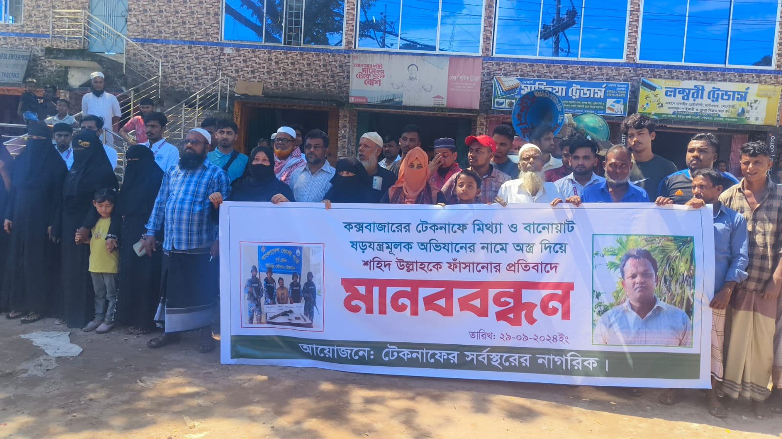 মানবন্ধনে উপস্থিত এলাকাবাসী বলেন, ‘মূলত ঘটনাটি হচ্ছে এলাকার চোরাকারবারি মোয়াজ্জেম হোসেন প্রকাশ দানু ও আবদুল আমিন প্রকাশ রুল্ল্যা মাঝিকে অবাঞ্ছিত ঘোষণা করে মুন্ডারডেইল নৌঘাটে মো. শহিদ উল্লাহকে সভাপতি বানানো হয়। ফলে তাদের চোরাচালান বাঁধা হয়ে দাঁড়ায় শহিদ। এ কারণে মাদক কারবারিরা ষড়যন্ত্র করে মিয়ানমার থেকে আসা অস্ত্র দিয়ে কোস্টগার্ডকে ভুল তথ্য দিয়ে সুপারি বাগানে অস্ত্র দিয়ে মিথ্যা মামলা ফাঁসিয়েছেন। শহিদ উল্লাহ কোন প্রকার অবৈধ মাদক ও মানবপাচারের সাথে জড়িত ছিল না।