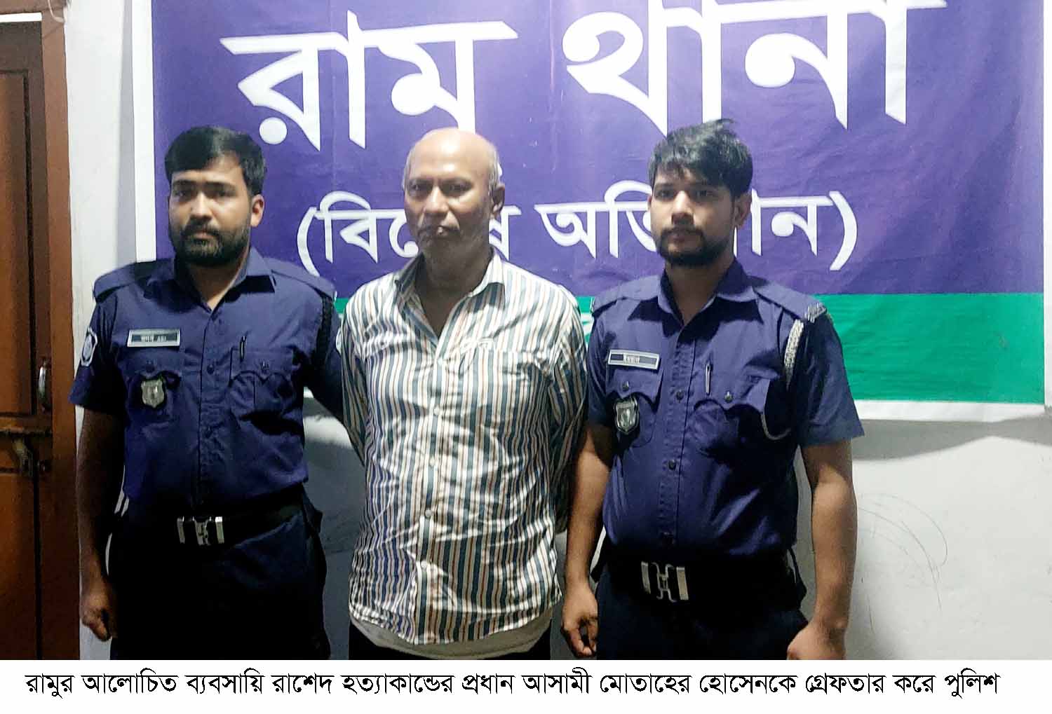 কক্সবাজারের রামু উপজেলার বহুল আলোচিত ব্যবসায়ীকে নুরুল আলম ছিদ্দিকী রাশেদ হত্যাকাণ্ডের প্রধান আসামি মোতাহের হোসেনকে গ্রেফতার করা হয়েছে। রামু থানা পুলিশ ঢাকার দক্ষিণ কেরানীগঞ্জ এলাকা থেকে শুক্রবার সকালে র্যাবের সহায়তায় তাকে আটক করে। শুক্রবার সন্ধ্যায় তাকে রামু থানায় নিয়ে আসা হয়। গ্রেফতারকৃত মোতাহের হোসেন (৫৭) রামু উপজেলার রাজারকুল ইউনিয়নের ৯নং ওয়ার্ডের মুসলিমপাড়ার মৃত আবদুর রহিমের ছেলে।