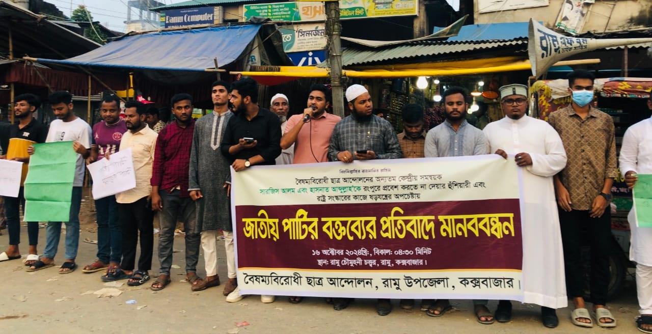 বুধবার বিকাল সাড়ে ৪টার দিকে রামুর চৌমুহনী চত্বরে আয়োজিত মানববন্ধনে বক্তারা জাতীয় পার্টি নেতার বক্তব্যের তীব্র নিন্দা ও বক্তব্য প্রত্যাহার প্রকাশ্যে ক্ষমা চাইতে বলেন।