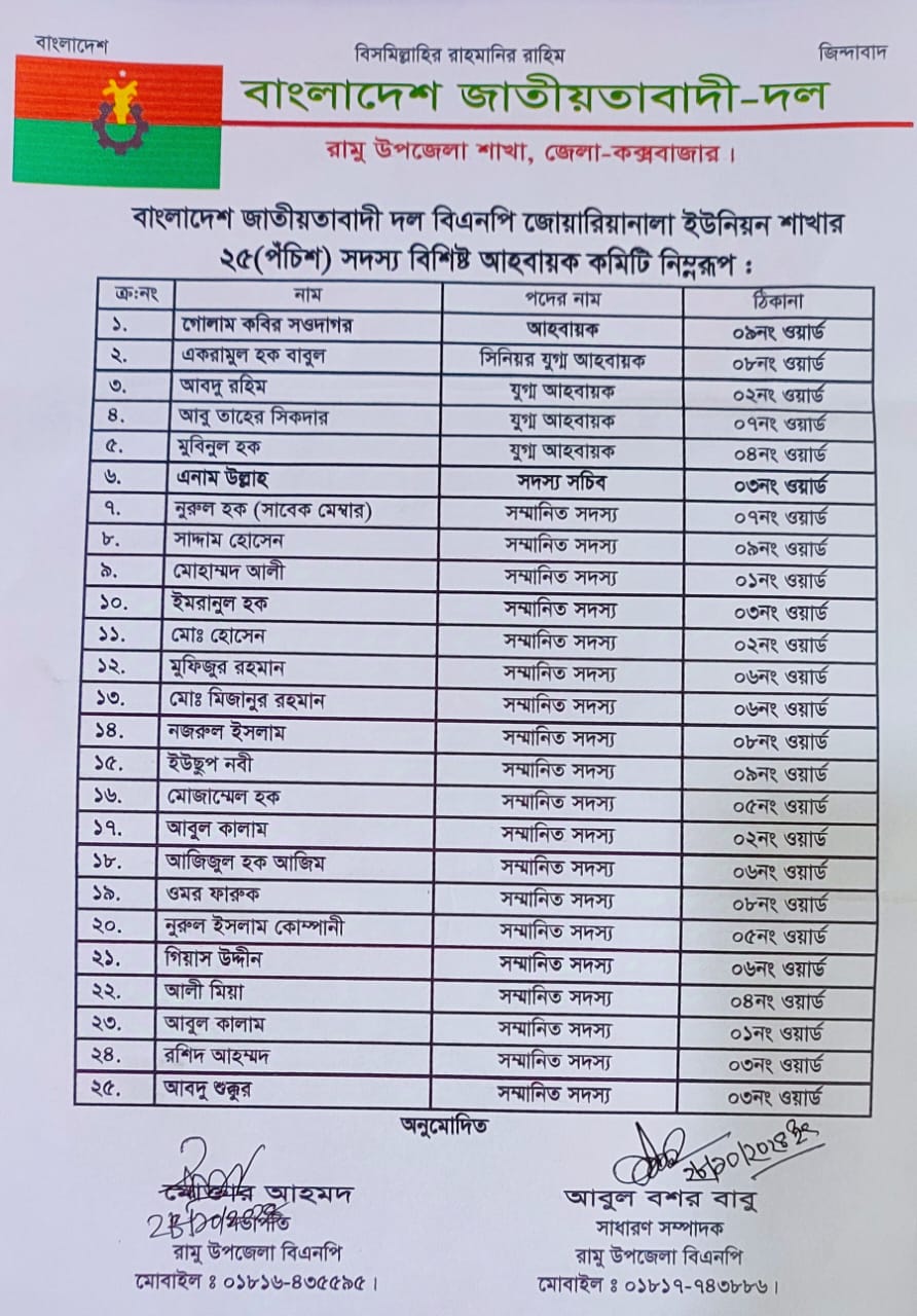 বাংলাদেশ জাতীয়তাবাদী দল-বিএনপি রামু উপজেলার জোয়ারিয়ানালা ইউনিয়নের আহবায়ক কমিটি গঠিত হয়েছে।
