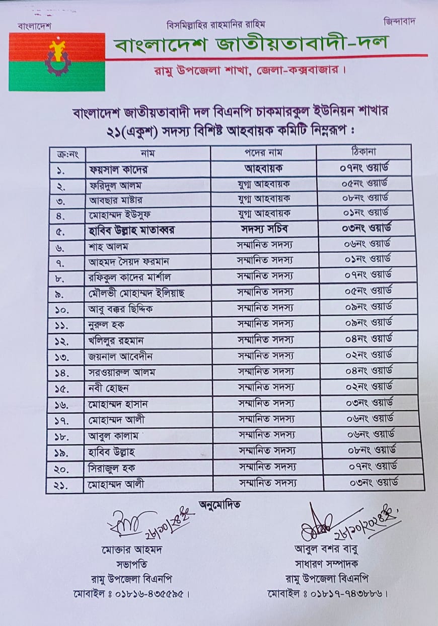 বাংলাদেশ জাতীয়তাবাদী দল-বিএনপি রামু উপজেলার চাকমারকুল ইউনিয়নের আহবায়ক কমিটি গঠিত হয়েছে।