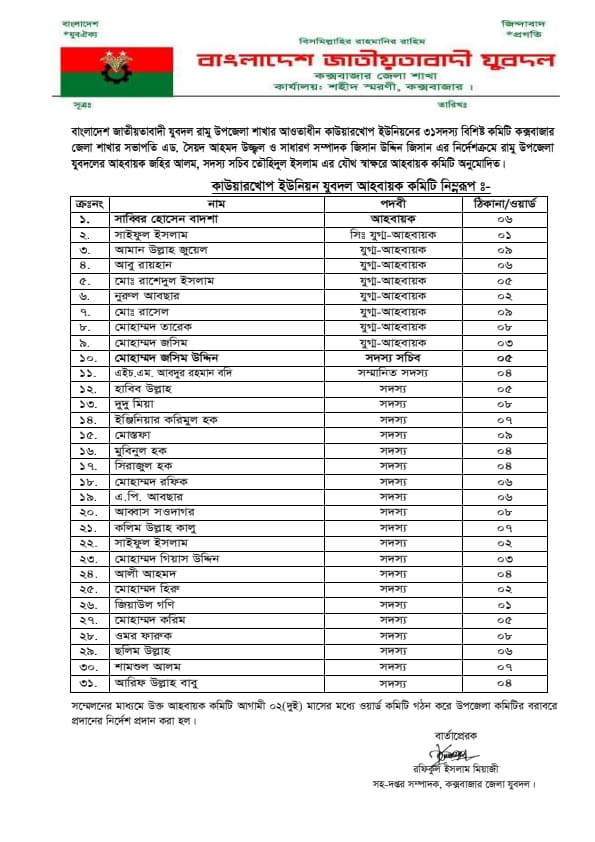 বাংলাদেশ জাতীয়তাবাদী যুবদল রামু উপজেলা শাখার আওতাধীন কাউয়ারখোপ ইউনিয়নের ৩১ সদস্য বিশিষ্ট কমিটি গঠিত হয়েছে।